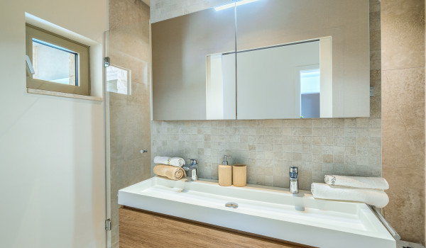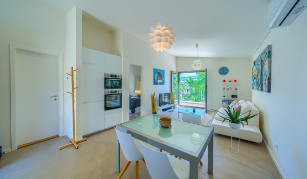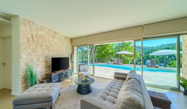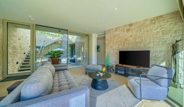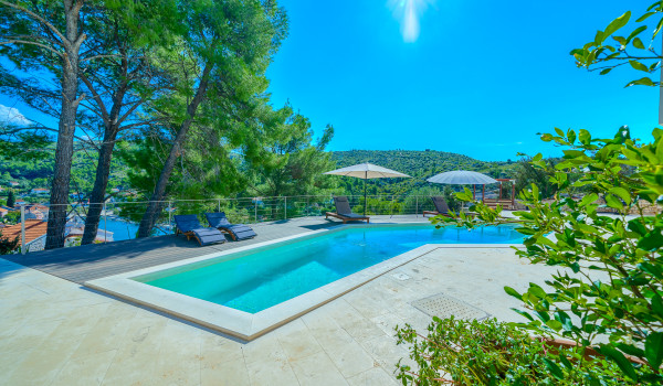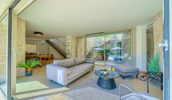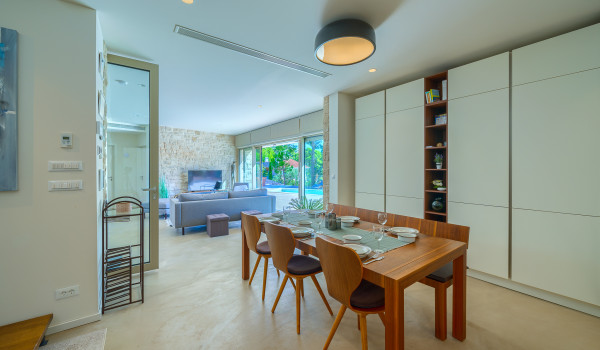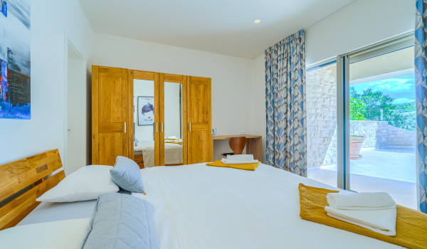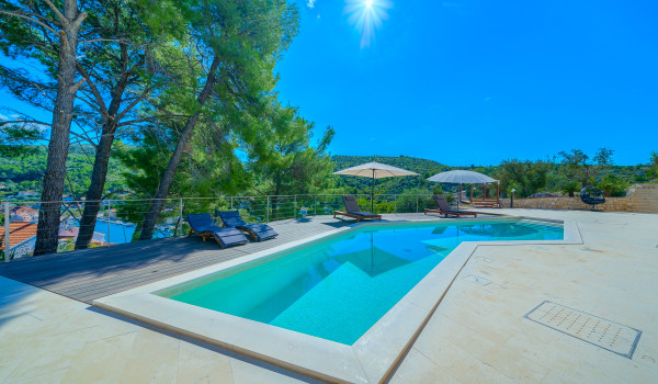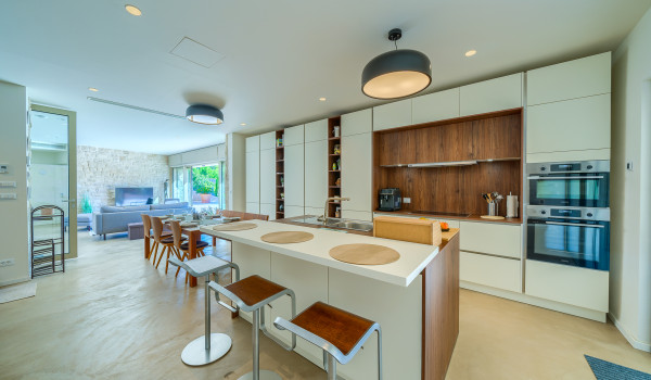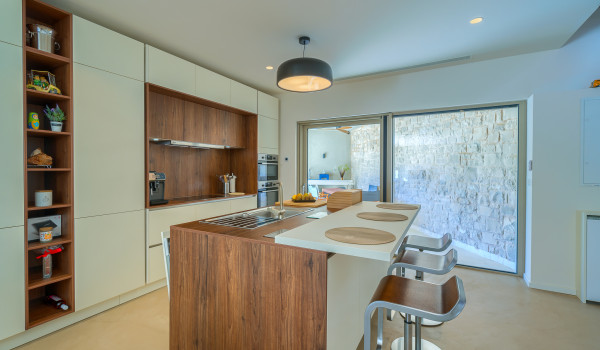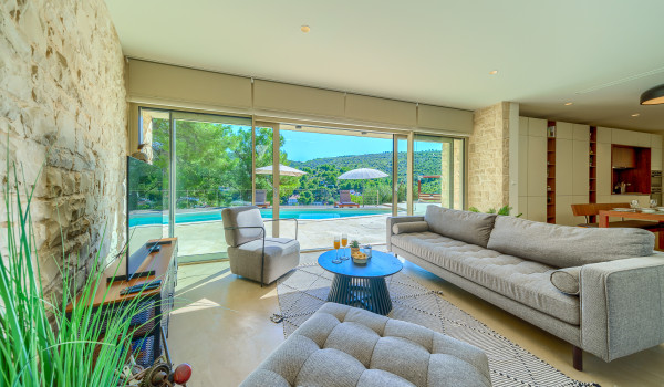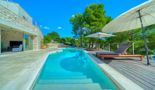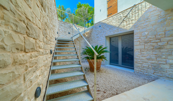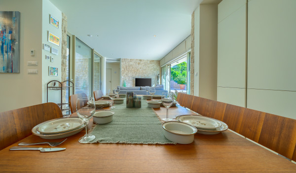 تفتح الأبواب الزجاجية المنزلقة الكبيرة على فناء واسع مجهز بـ مسبح خارجي مدفأ بمساحة 28 م²، كراسي استلقاء مريحة، مظلات شمسية، وشواية غاز، مما يجعله المكان المثالي للاستمتاع بغداء صيفي مع العائلة والأصدقاء. إذا كنت تفضل ترك الطهي للمحترفين، يمكنك دائمًا الاستعانة بفريق الطهي المحترف (طاهٍ ونادل) لإعداد أشهى الأطباق الدلماسية لك ولأحبائك.