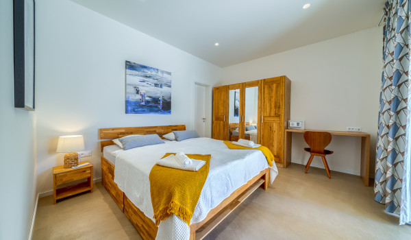 يضم غرفة النوم الرئيسية الفاخرة، الواقعة في الطابق الأرضي، حمامًا داخليًا مع دش واسع، مستلزمات استحمام مجانية، سرير بحجم كينغ، مع إمكانية الوصول المباشر إلى الفناء والمسبح. الغرفة مكيفة بالكامل ومجهزة بـ تلفزيون، واي فاي، بياضات الأسرّة، مناشف ومكتب، مما يجعلها مثالية لأولئك الذين لديهم التزامات عمل. كما يتوفر مرحاض ضيوف في هذا الطابق.