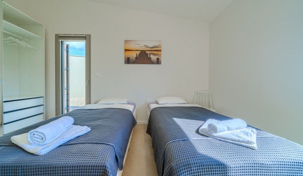 تؤدي السلالم الخشبية إلى الطابق العلوي، حيث توجد غرفتا نوم بسريرين منفصلين تتشاركان حمامًا واحدًا. كل غرفة مجهزة بـ تلفزيون وبياضات أسرّة، ولها مدخل خاص إلى التراس مع إطلالة خلابة. يضم الحمام دشًا، مرحاضًا ومناشف. كما يحتوي هذا الطابق على غرفة ألعاب مزودة بـ تلفزيون/DVD، مقاعد استرخاء، وألعاب أركيد.