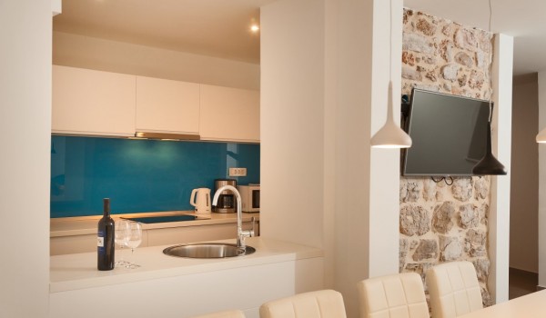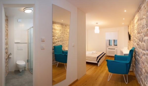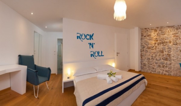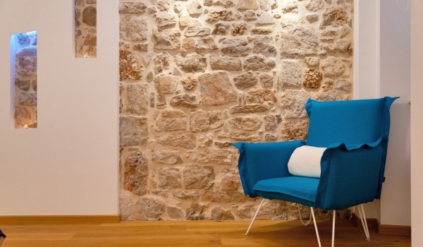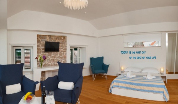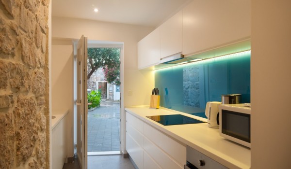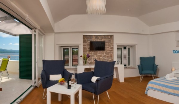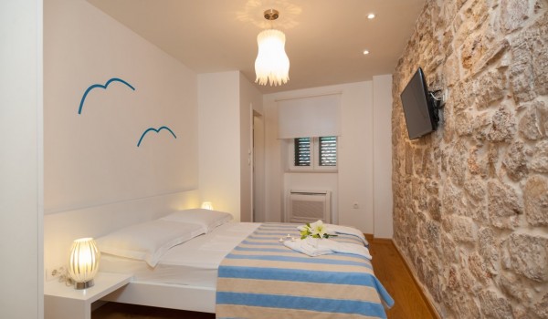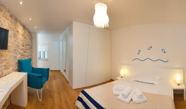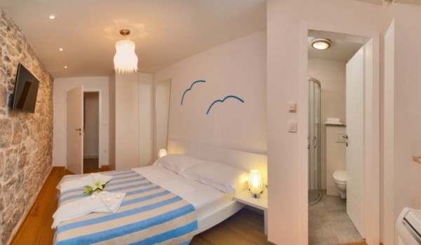 يرتبط الطابق الأرضي من خلال درج داخلي بالطابق الأول من هذه الفيللا الخاصة عن طريق البحر. يوجد في هذا الطابق منطقة للنوم تحتوي على غرفتي نوم مع حمامات ملحقة بها دش. غرفة واحدة مجهزة بسرير مزدوج 160x200 سم ، والأخرى مجهزة بسرير مزدوج 140x200 سم. يؤكد الحجر على تفرد هذه المساحة مع العناصر الحديثة.