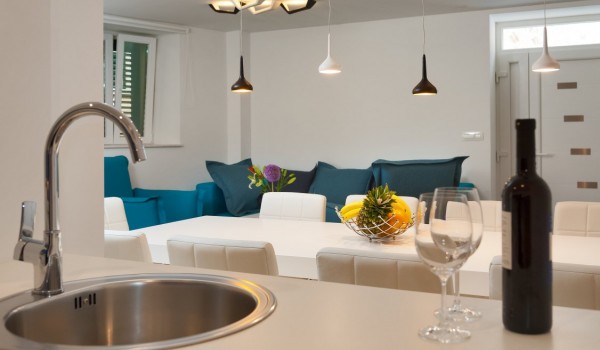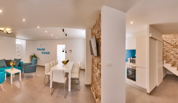 عند دخولك إلى الطابق الأرضي من فيلا العطلات هذه ، سوف تشعر بالذهول من خلال المزيج الاستثنائي بين الحداثة والدلماسية. يتم الجمع بين الألوان الحجرية والألوان الدلماسية الحقيقية ، الأبيض والأزرق ، بألوان حديثة وفاخرة بشكل مثالي. يوجد في الطابق الأرضي مطبخ مجهز بالكامل وغرفة طعام حديثة وغرفة معيشة حيث يمكنك الاسترخاء والاستمتاع برفقة جيدة. توفر غرفة المعيشة أيضًا إمكانية الوصول إلى ساحة الفناء حيث يوجد مسبح خارجي ويوجد أيضًا مرحاض للضيوف في هذا الطابق.