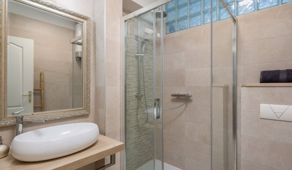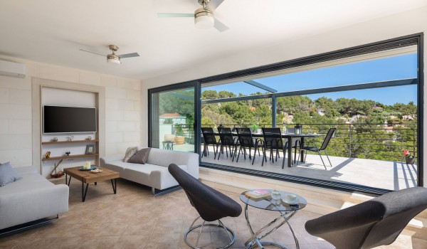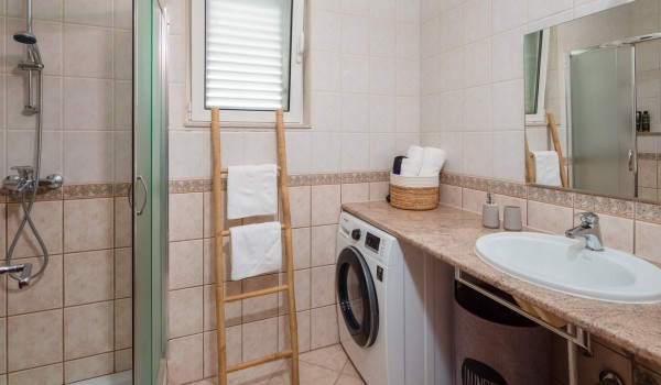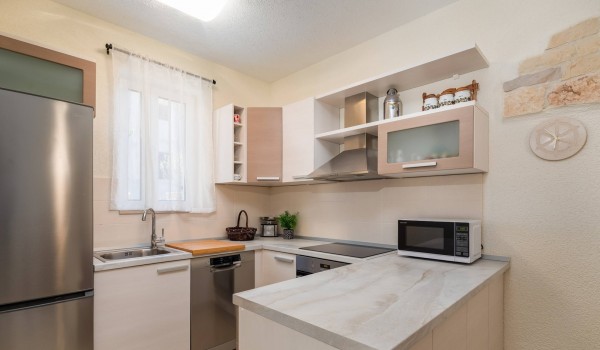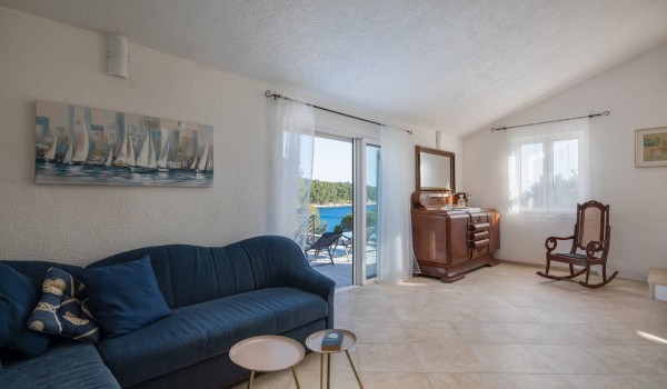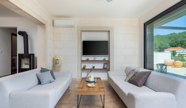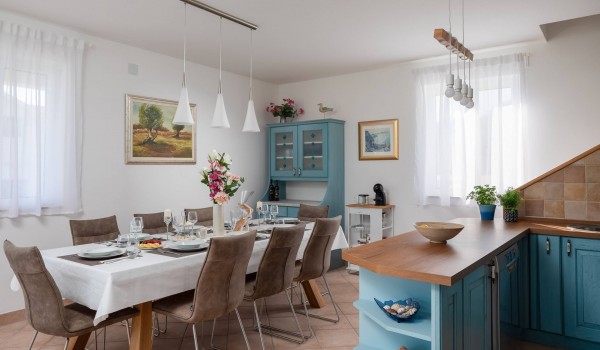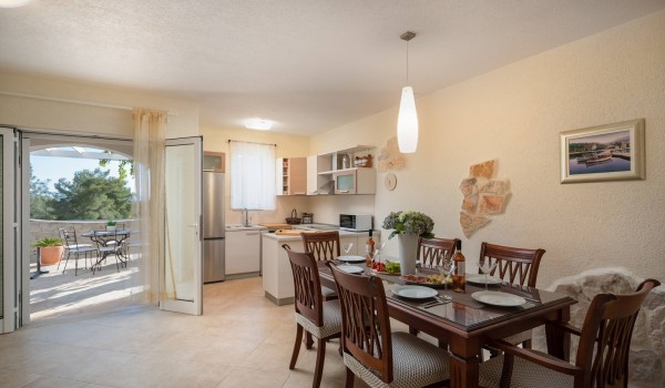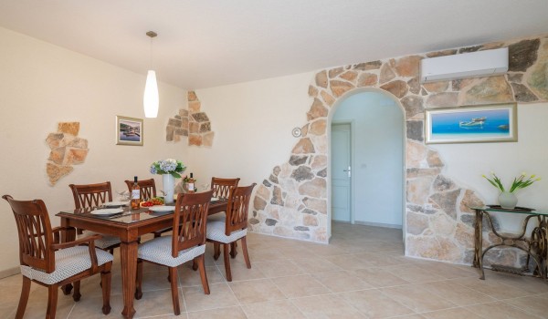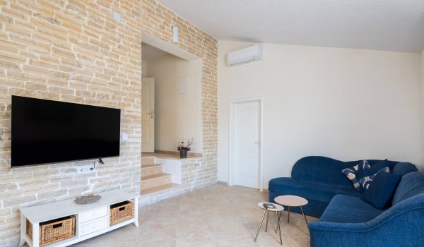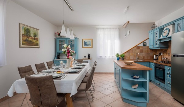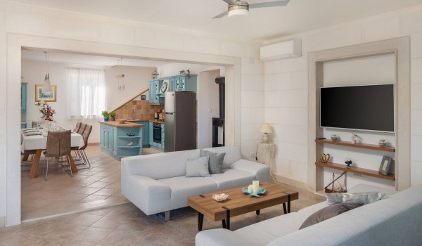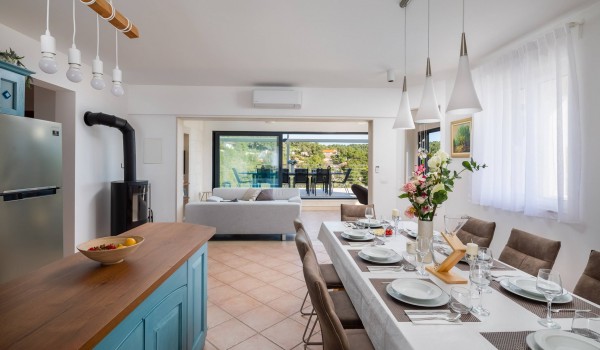 من الشرفة الخارجية يمكنك الدخول إلى الطابق الأرضي حيث تقعغرفة جلوس واسعة مع أثاث مريح وتلفزيون LCD وطاولة طعام لـ 6 أشخاص ومطبخ حديث مجهز بالكامل. من غرفة الطعام وغرفة المعيشة ، يمكنك الخروج إلى الشرفة ، والتي توفر إطلالة جميلة على البحر الأدرياتيكي والطبيعة المحيطة بالفيلا. هناك طاولة و 6 كراسي على الشرفة. يوجد في هذا الطابق غرفتا نوم مع أسرّة توأم وحمامات خاصة مع دشات.