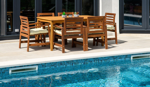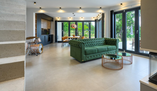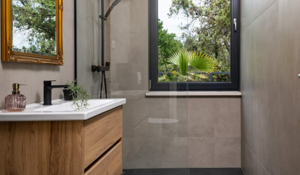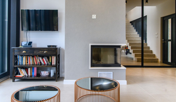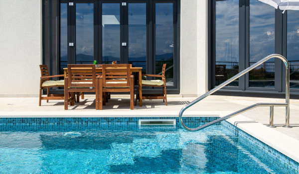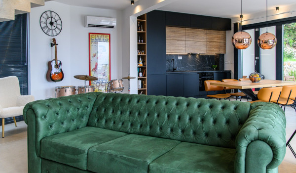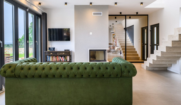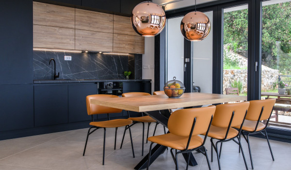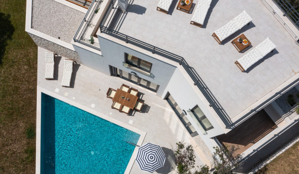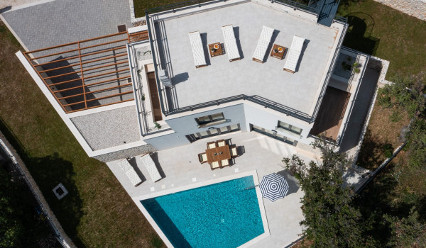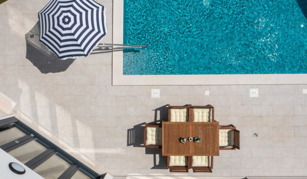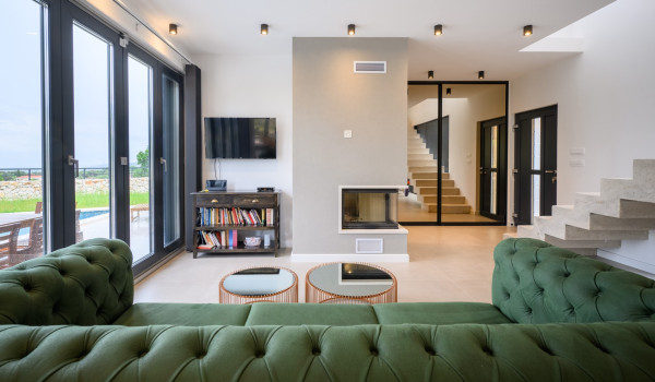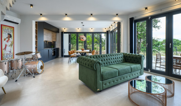 منطقة المعيشة والمطبخ وتناول الطعام في هذه الفيلا الدالماسية الفاخرة متصلة أيضًا بمنطقة المسبح الخارجية والفناء من خلال مجموعتين من الأبواب الزجاجية التي تسمح بدخول الضوء وتوفر الوصول إلى منطقة المسبح المحاطة بكراسي الاستلقاء ومظلة ومنطقة طعام خارجية. بجوار طاولة الطعام الخارجية، يوجد شواية. يمكنك أيضًا الاستمتاع بإطلالة على بستان الزيتون الخاص، المسبح، بالإضافة إلى إطلالات على الجبال والبحر من الحديقة وسطح الفيلا.