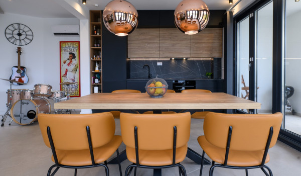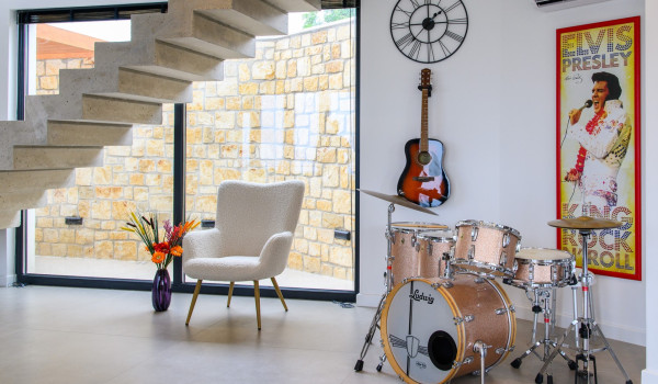عند الدخول من الباب الرئيسي، ستجد غرفة المعيشة المكيّفة بالكامل مع أريكة فاخرة، تلفزيون LCD SAT، واي فاي، مجموعة طبول للضيوف الموسيقيين ومدفأة خشبية. إلى الأمام، هناك مطبخ عصري مجهز بالكامل مع ميكروويف، فرن، موقد، ثلاجة، محمصة خبز، غسالة أطباق، أدوات مائدة، آلة صنع القهوة، مجمد، وطاولة طعام تتسع لـ6 مقاعد.