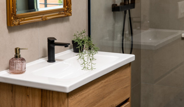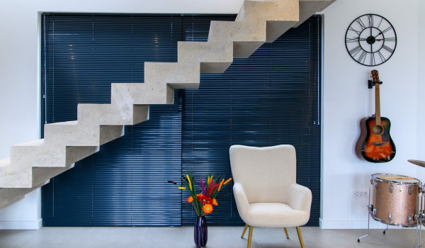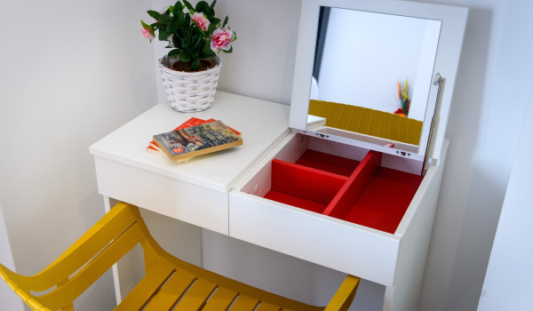 بالقرب من المدخل الرئيسي للمنزل توجد درج يؤدي إلى الطابق العلوي الذي يحتوي على غرف نوم وحمام مشترك. في الطابق الأرضي، بجانب المدخل، خلف المدفأة، يوجد حمام. هذا الحمام يحتوي على دش مفتوح، تدفئة، مجفف شعر ومناشف. كما تحتوي الحمامات على تدفئة تحت الأرضية.
