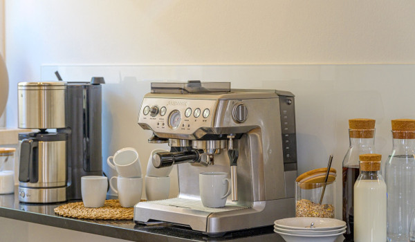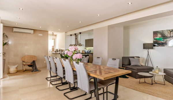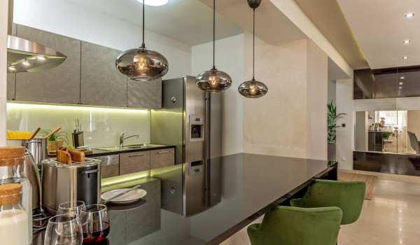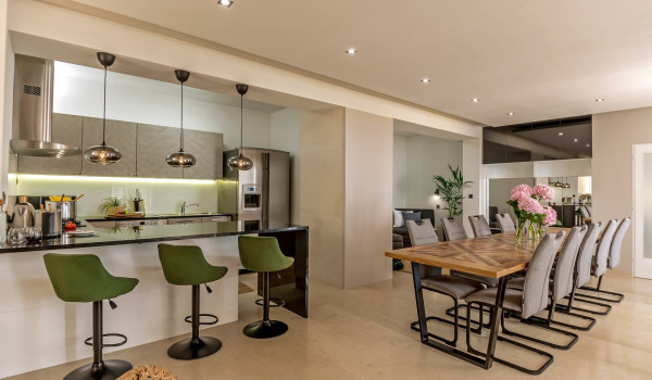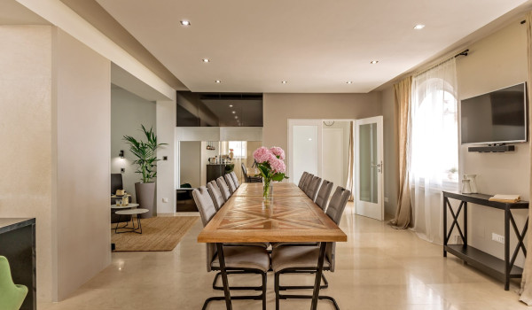 من الشرفة ، تؤدي السلالم إلى رواق ساحر به مكتب مليء بضوء النهار ، حيث توجد غرفة طعام واسعة مع طاولة طعام تتسع لـ 14 شخصًا ومطبخًا محترفًا معًا. وجد تلفزيون SMART على الحائط مكانه المثالي هناك ، بالإضافة إلى منطقة جلوس بها كرسيان بذراعين وطاولة قهوة. المطبخ مع جزيرة ومقاعد بار أنيقة مجهزة بالكامل بجميع الأطباق الضرورية ، وموقد ، ومجمد ، وغسالة صحون ، وثلاجة ، وفرن ميكروويف ، وغلاية ، وطباخ بيض ، وآلة صنع القهوة ومحمصة.