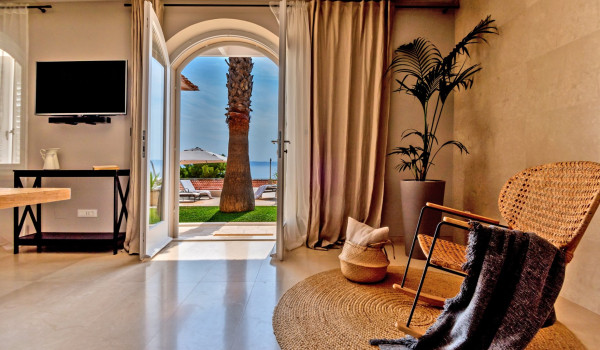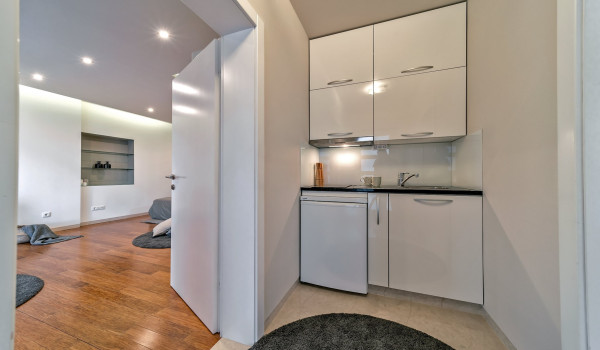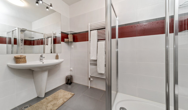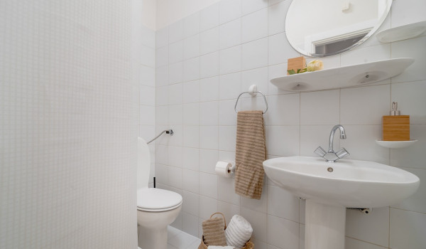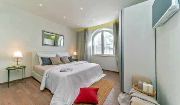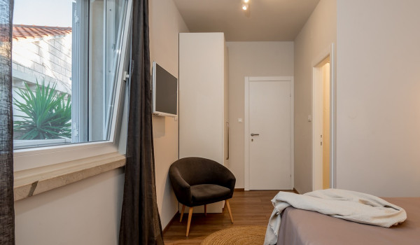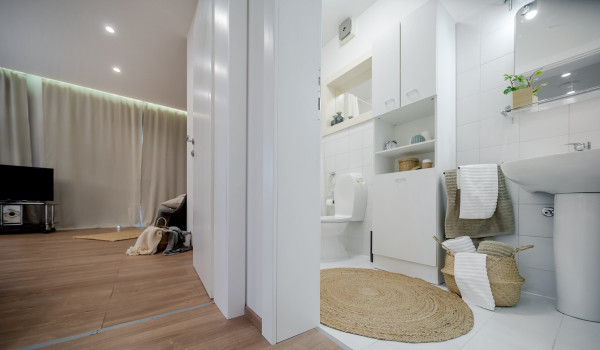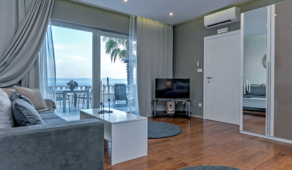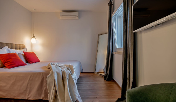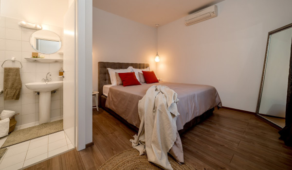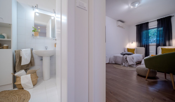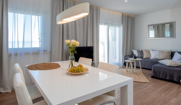 بالإضافة إلى المطبخ وغرفة الطعام ، يؤدي المدخل على الجانب الآخر إلى حمام مشترك مع كابينة دش ومرحاض منفصل ، ثم إلى غرفة وسائط مشتركة ساحرة مع تلفزيون SMART وأريكة زاوية تؤدي إلى الأول غرفة نوم مع حمام داخلي مجهز بدش كابينة. تحتوي غرفة النوم هذه على سرير مزدوج وتلفزيون SMART وإطلالة جميلة على البحر.