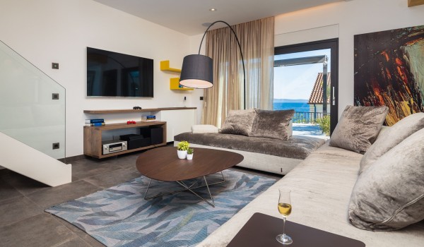 من مدخل Villa Blue Heaven يمكنك دخول الطابق الأرضي بالكامل من الفيلا من خلال عدة أبواب وجدران زجاجية تربط هذه المساحة بأكملها بلطف في واحة واحدة ممتعة للمعيشة. ستجد في الطابق الأرضي من Villa Blue Heaven Ciovo غرفة معيشة مريحة مع أريكة يمكن تمديدها إلى سرير مريح لشخصين وتلفزيون إل سي دي (Smart 4K TV 65 بوصة) ومنطقة جلوس مع طاولة وكراسي تتسع لـ 10 أشخاص ومطبخ أبيض حديث مجهز بالكامل بالجزيرة.