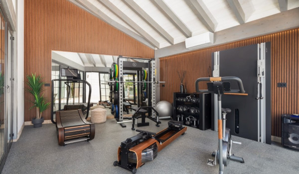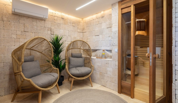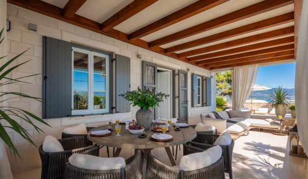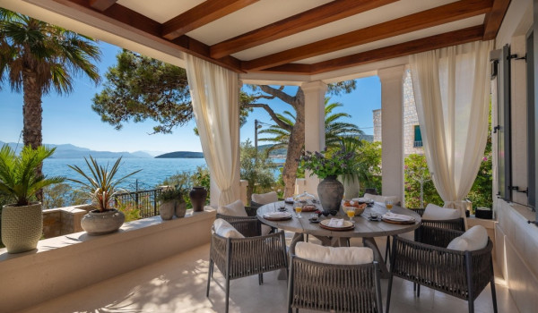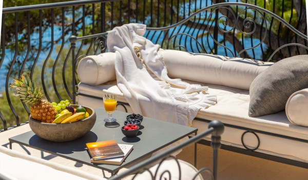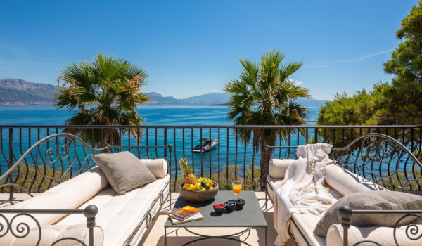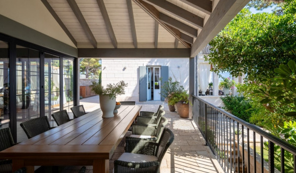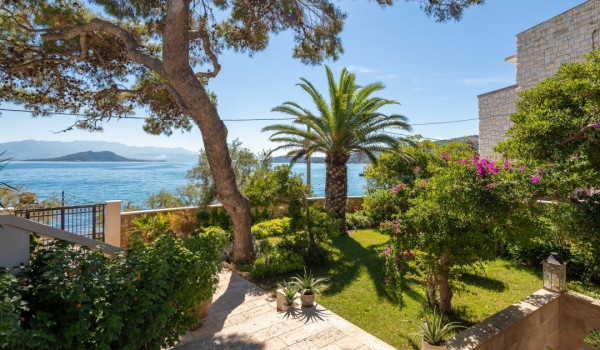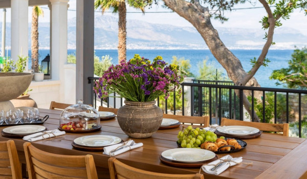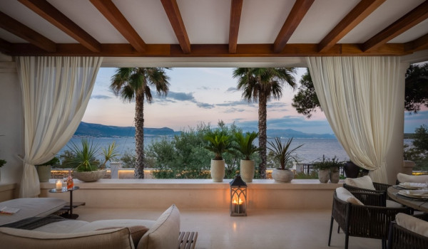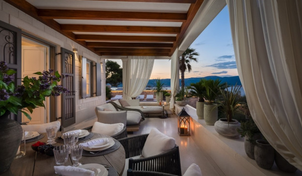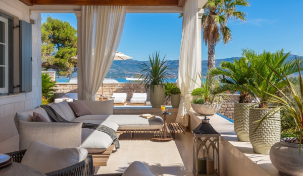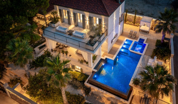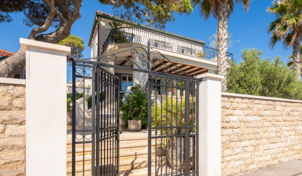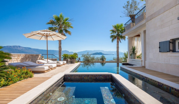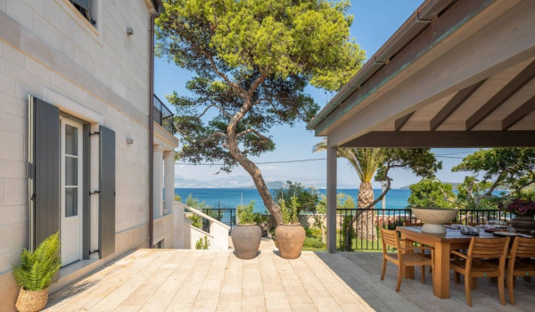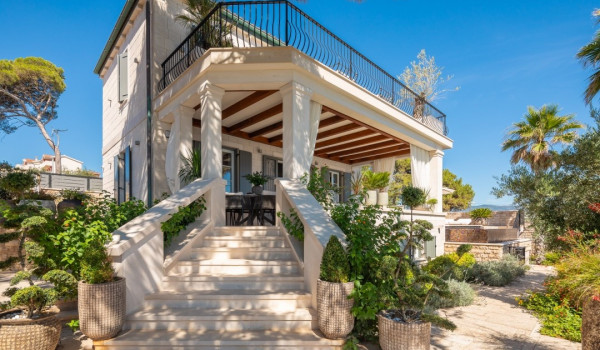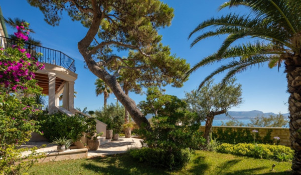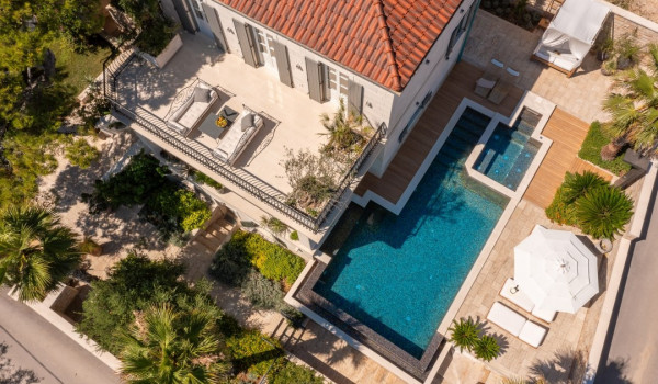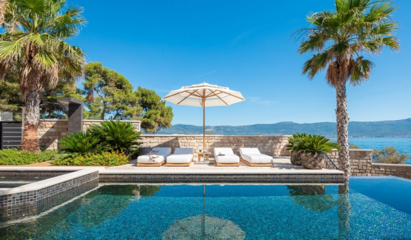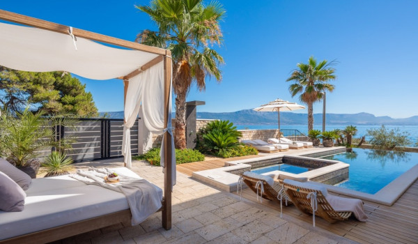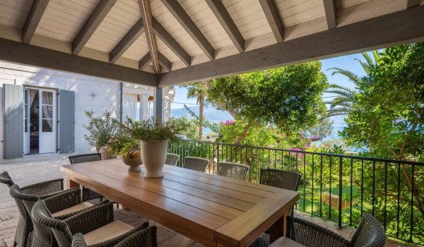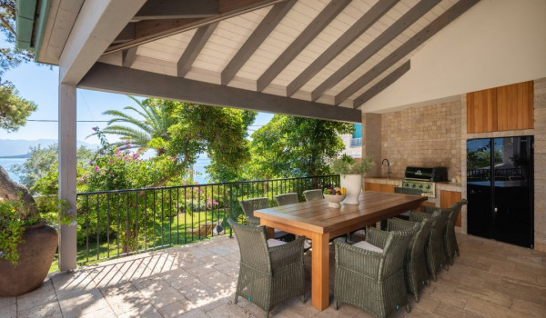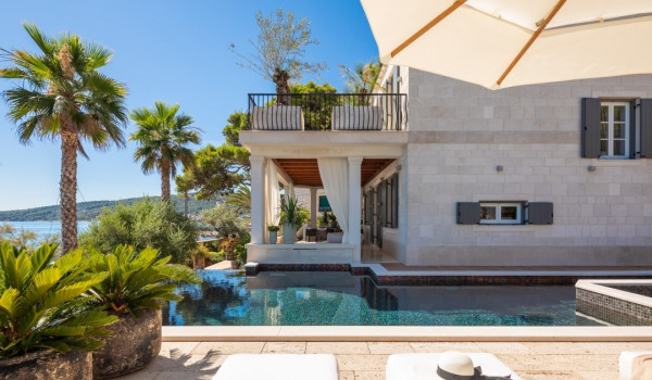 مركز هذا الممتلكات الخاصة على البحر هو فناؤها الرائع بأشجار النخيل وبستان. في حضن هذه الخضرة الكثيفة، وجدت كوخ حجري مكانها ويتألف من منطقة تناول طعام واسعة لعشرة أشخاص ومطبخ صيفي وشواية غاز. تقع بركة السباحة الخاصة الجميلة (45 متر مربع) مع جاكوزي على تراس أمام البحر للفيلا للعطلات، وتحتوي الفيلا أيضًا على ساونا خاصة وصالة ألعاب رياضية تتاح للضيوف.