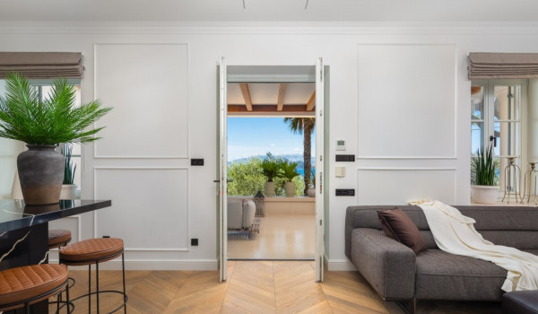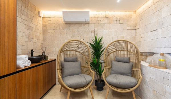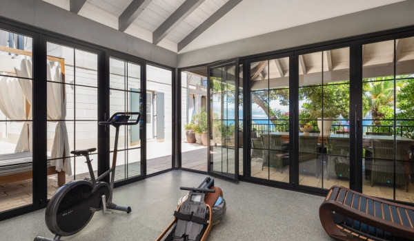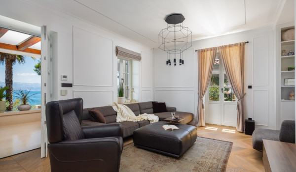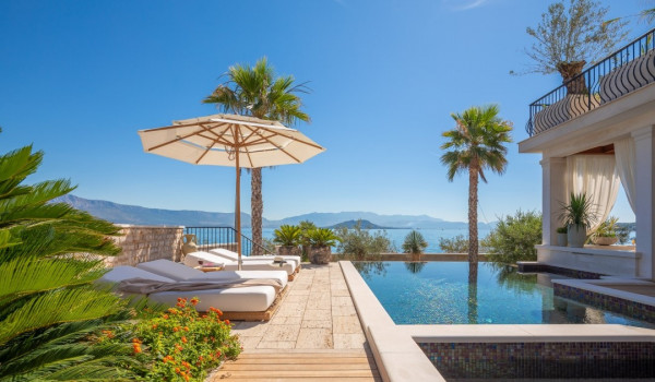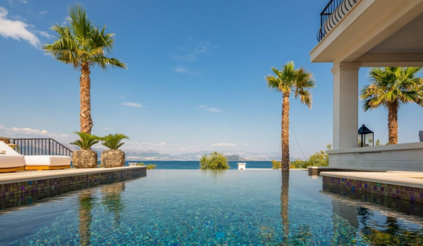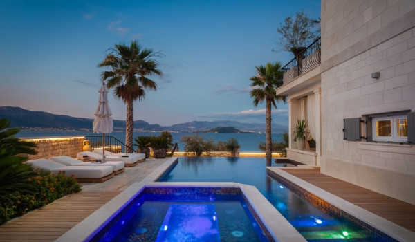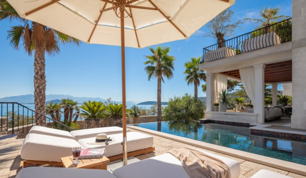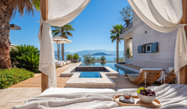 الجزء الرئيسي من هذا العقار الأخضر الساحر هو فناء البسين بجوار البحر مع حمام السباحة اللانهائي الخاص المُدَفأ بمساحة 42 متر مربع مع إطلالة بحرية بانورامية غير منقطعة. ينقسم البحر إلى منطقة الاستحمام الهيدرومساج في الجاكوزي المدمج ومنطقة البحر الرئيسية المحاطة بشرفة للتشمس مع كراسي شمس بيضاء مريحة ومنطقة صالة. تحيط القسم بأكمله بالخضرة والنخيل مما يضمن الخصوصية التامة في هذه الملكية الخاصة المحاطة بالبحر. تأتي هذه الفيلا الفاخرة والمناسبة للحيوانات الأليفة للإيجار والعطلات عن البحر مكيفة بالكامل ومجهزة بتدفئة تحت الأرض.