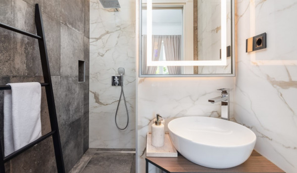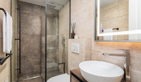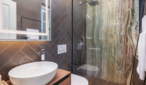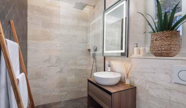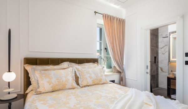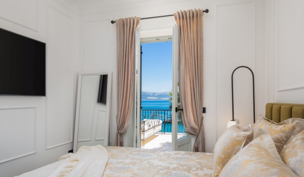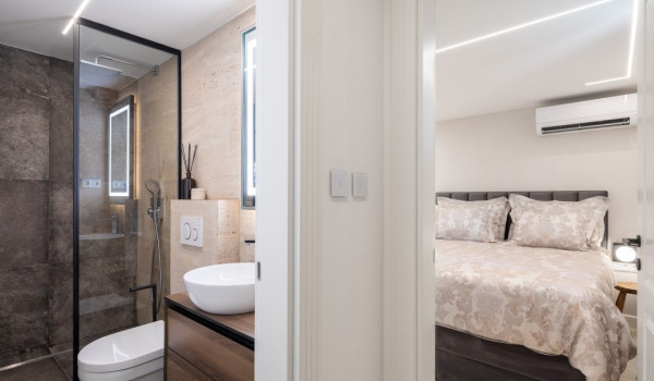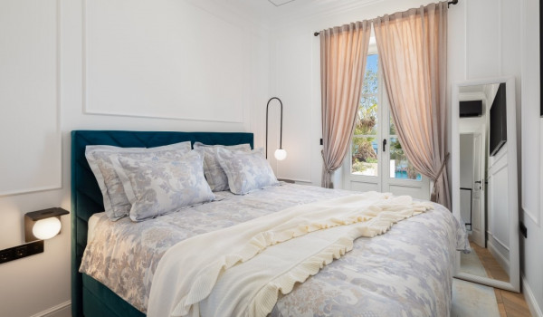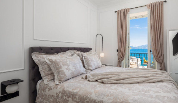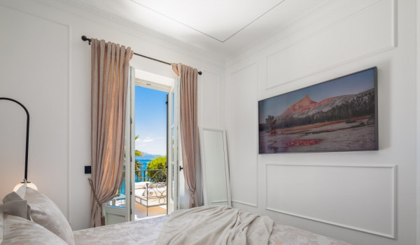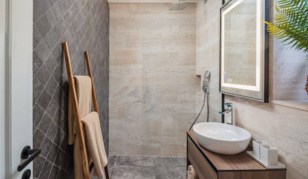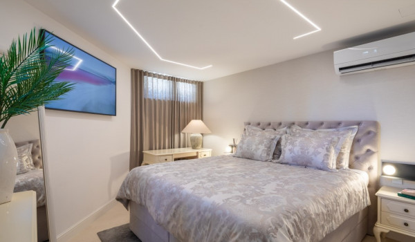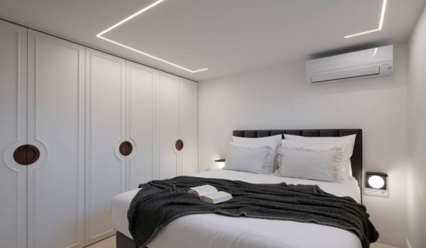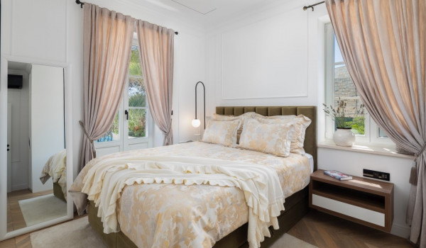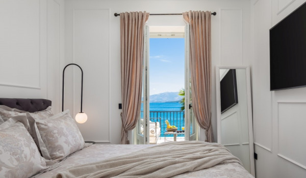 جزء ساحر خاص للغاية من هذه الفيلا الجميلة على البحر يقع أسفل الطابق العالي ويتألف من غرفتي نوم مُزَيَّنتين بفخامة مع أسرة بحجم كوين، والتي تشترك في حمام مع دش مشي. جميع غرف النوم في هذه الفيلا الجميلة لقضاء العطلات مع العائلة والأصدقاء مكيفة الهواء ومجهزة بتلفزيونات SMART.
