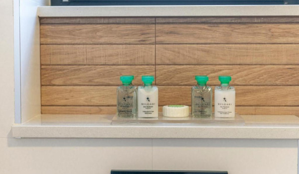 يحتوي المرحاض في الطابق الأرضي على صابون سائل Bvlgari وأعواد دخان Rituals.