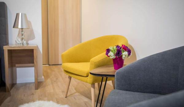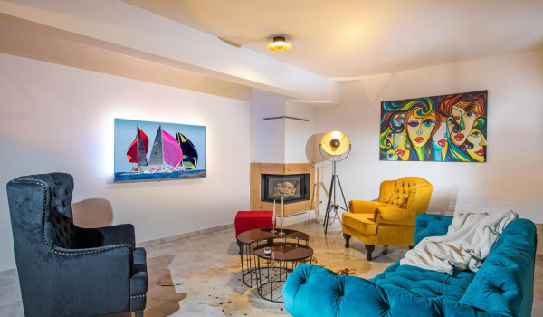 من خارج فيلا العطلات مع حوض سباحة، من خلال جدار زجاجي ، تدخل المساحة المكيفة حيث يوجد مطبخ مع بار وطاولة طعام. غرفة معيشة مجهزة على الطراز الحديث مع أرائك بألوان زاهية ومدفأة تضفي الدفء على المساحة المزججة ، لذا فهي تنضح بالانتعاش والضوء الطبيعي. يوجد في الطابق الأرضي غرفة واحدة مريحة مع حمام داخلي مع دش.