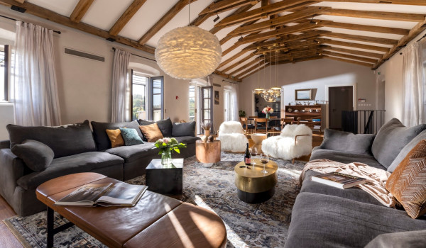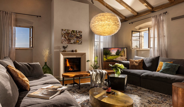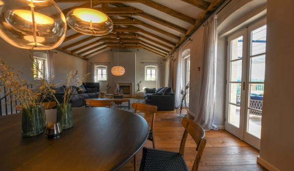 تقع في الطابق الأول من فيلا الضيوفغرفة معيشة مزينة بعوارض خشبية في السقف وأرائك مريحة يمكنك الاستمتاع بها أثناء اشعال النار في المدفأة الداخلية. غرفة المعيشة متصلة بغرفة الطعام ومطبخ مجهز بالكامل ، مما يخلق انطباعًا بمفهوم مفتوح. تحتوي هذه المساحة المشتركة على مخرج إلى الشرفة حيث توجد طاولة طعام وأماكن جلوس مريحة. يوجد مرحاض إضافي بجوار غرفة المعيشة.