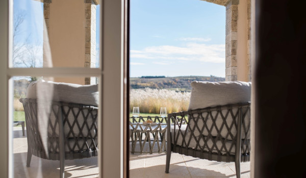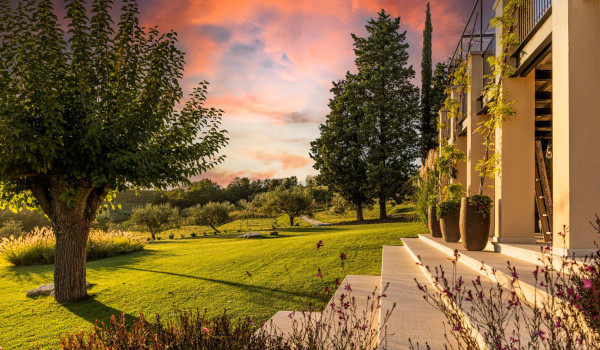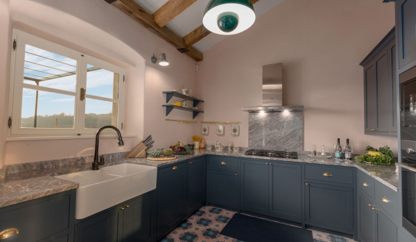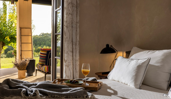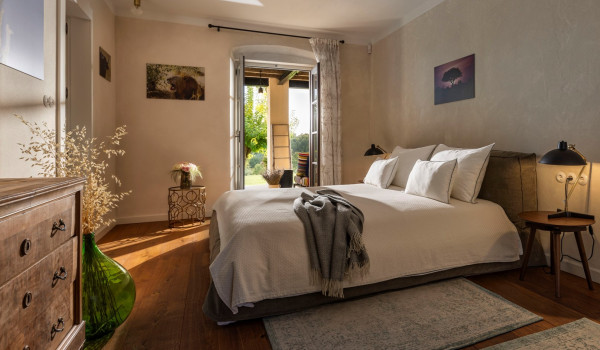 تؤدي السلالم الخشبية الداخلية إلى الطابق الأول حيث يقع جناح بسرير كينج وحمام داخلي مع حوض استحمام ودش ومكتب وخزانة ملابس وكرسي بذراعين مريح. يحتوي هذا الجناح الكينج أيضًا على مخرج إلى الشرفة مع إطلالة جميلة على المناظر الطبيعية الساحرة حيث لا يوجد سوى جيرانك الذين يبلغ عمرهم قرونًا من أشجار الزيتون وكروم العنب التي تسقط في الريح أسفل الشرفة. يوجد أيضًا ركن للسيجار في هذه الشرفة الصيفية. يوجد في الطابق الأول أيضًا غرفة استرخاء مع تلفزيون إل سي دي وأريكة وكرسي مريح.