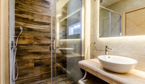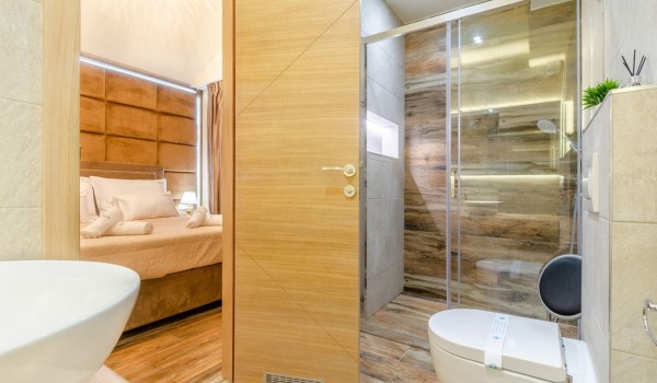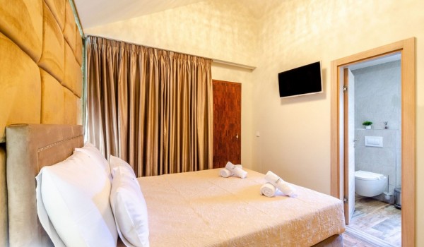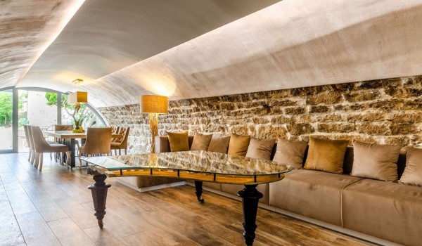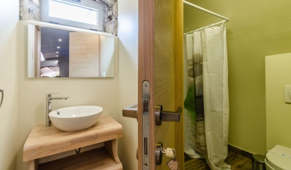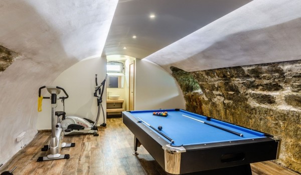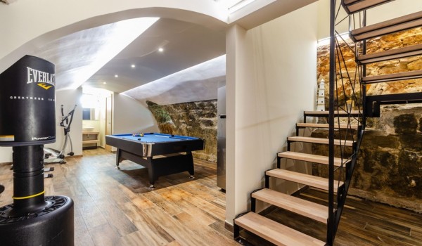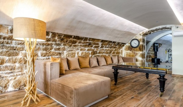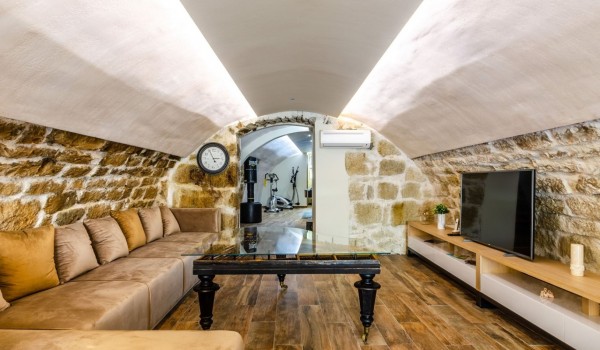 نهبط بالدرج إلى مدخل فيللا العطلات التي تتكون من فتحة زجاجية نصف دائرية تسمح بأقصى قدر من ضوء النهار. ندخل إلى منطقة الطابق الأرضي من الفيلا ، والتي تتكون من مطبخ مجهز بالكامل ، وغرفة طعام مع طاولة طعام خشبية تتسع لـ 8 أشخاص، وغرفة معيشة مع أريكة مريحة واسعة وتلفزيون إل سي دي. هذه المساحة المرتبة بعناية والتي تهيمن عليها المواد التقليدية جنبًا إلى جنب مع التفاصيل الحديثة تنضح بالدفء والراحة. يوجد في الطابق السفلي غرفة حفلات حيث يتوفر للضيوف طاولة بلياردو ومعدات لياقة بدنية لعشاق الإجازة النشطين. يوجد في هذا الطابق حمام مع دش.