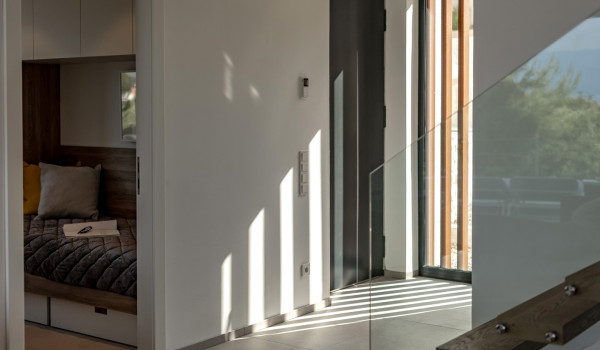 عند وصولك إلى موقف السيارات الخاص بهذه الفيلا الفاخرة لقضاء العطلات، المحاطة بـأشجار الزيتون وتتمتع بـإطلالة خلابة على البحر، ستجد مدخل الفيلا على الجانب الأيسر من العقار، والذي يقودك إلى المدخل الرئيسي حيث تبدأ تجربة إقامتك الحصرية.
