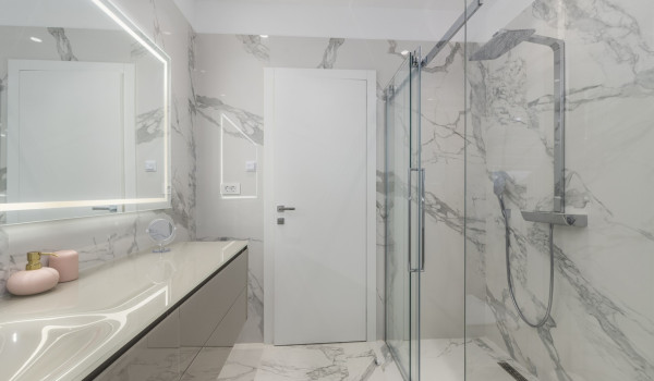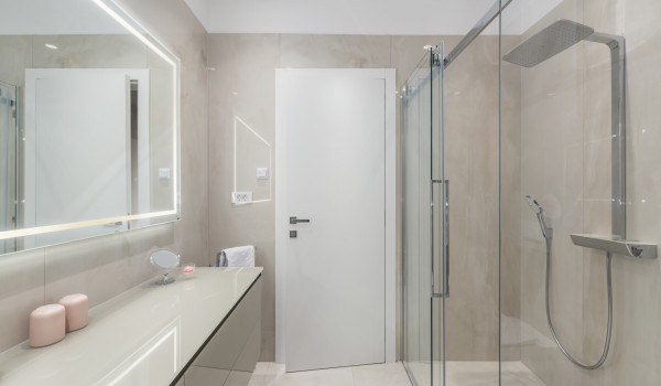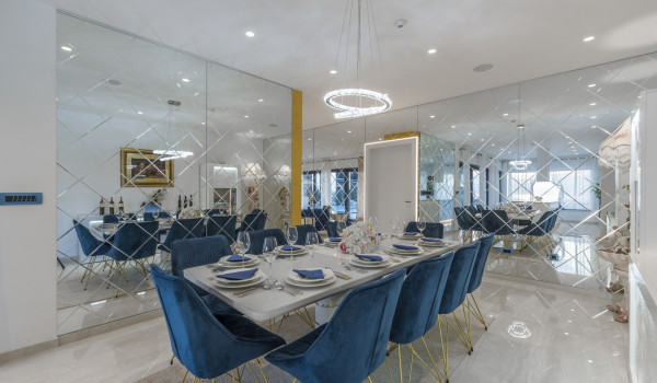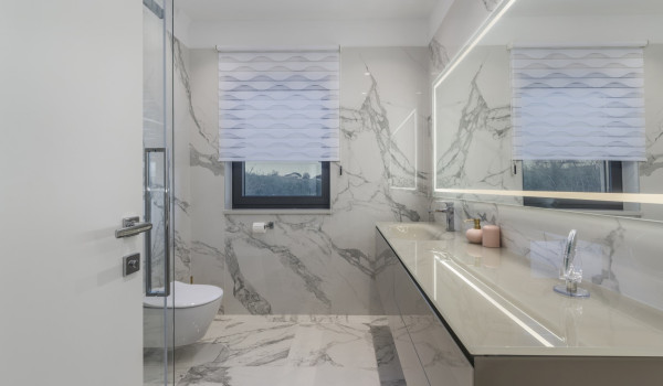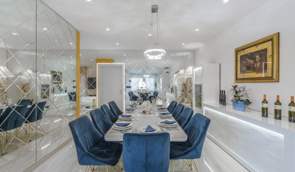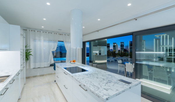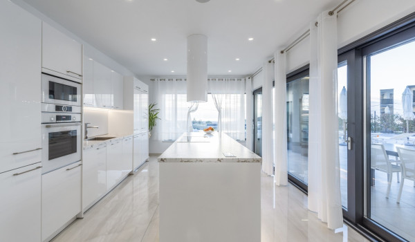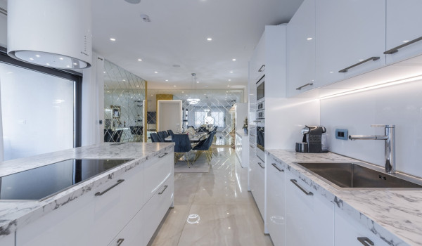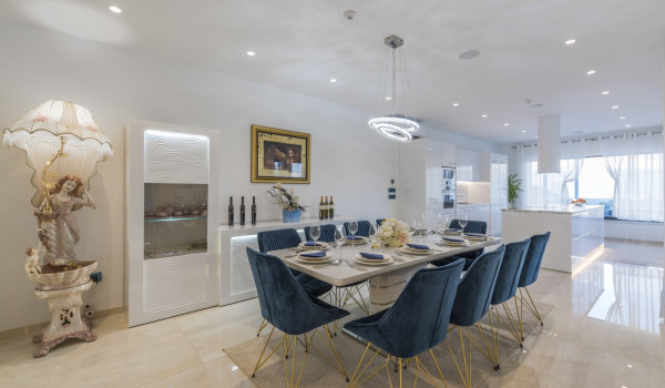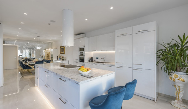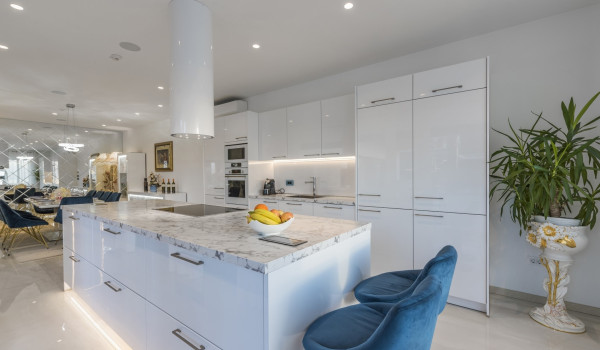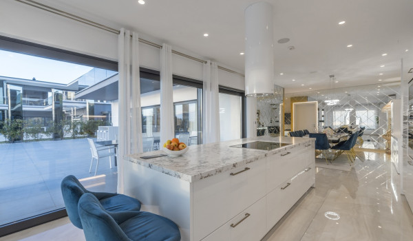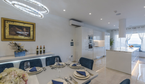 من التراس الخارجي مع حمام السباحة وكراسي الاستلقاء، يمكنك الدخول إلى الطابق السفلي لهذه الفيلا الفاخرة في دالماتيا من خلال جدار زجاجي كبير، الذي ينقسم إلى مطبخ مجهز بالكامل مع منطقة لتناول الطعام وغرفة معيشة مريحة. التفصيل الأول الذي يلفت انتباهنا عند دخول فناء الفيلا هو طاولة الطعام الحديثة المميزة بالكراسي، المزينة بفازات كبيرة تحتوي على نباتات مختلفة، والتي تحدد بشكل مثالي الفضاء الكامل وتضفي عليها قدرًا من السحر. تحظى هذه الطاولة الخاصة بتقسيم الفضاء بصريًا بين المطبخ وغرفة المعيشة. المطبخ مزين بأسلوب عصري بألوان فاتحة، وتسود الظلال الخفيفة في تناغم مع التفاصيل السوداء. بين الطاولة وعناصر المطبخ البيضاء، هناك جزيرة مطبخ بيضاء مع موقد وفرن ومبرد للنبيذ واثنين من كراسي البار. يكتمل الفضاء بستائر كبيرة بيج فاتح.