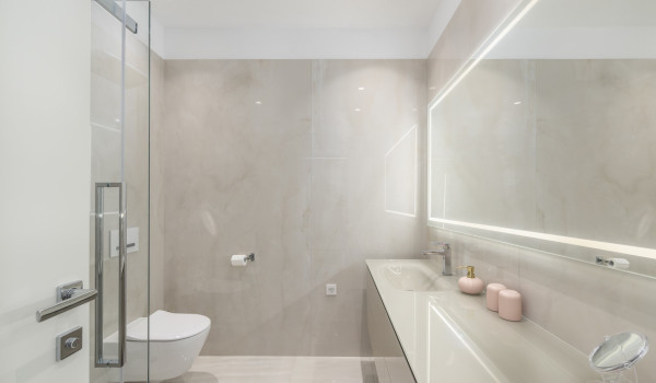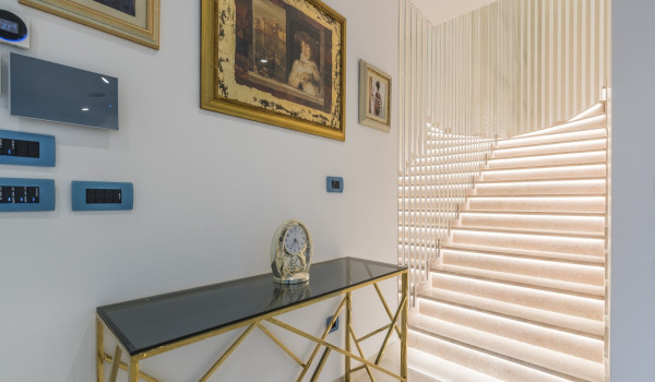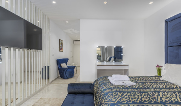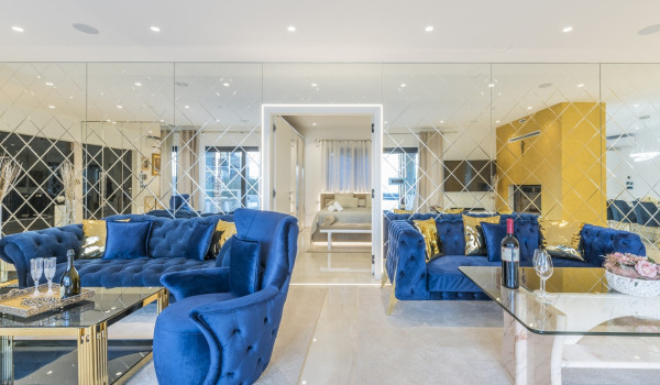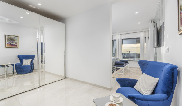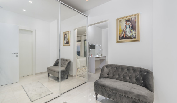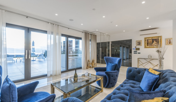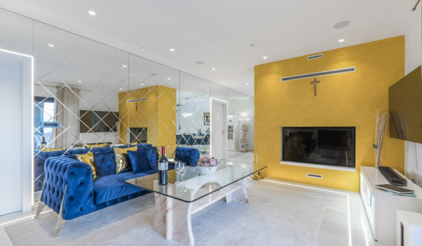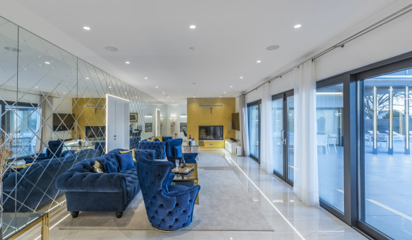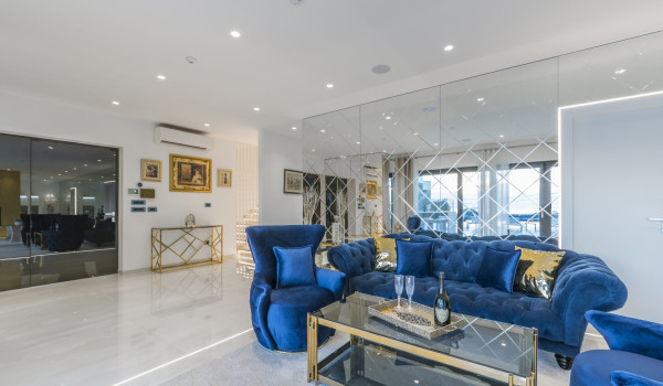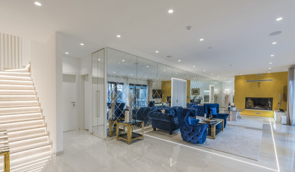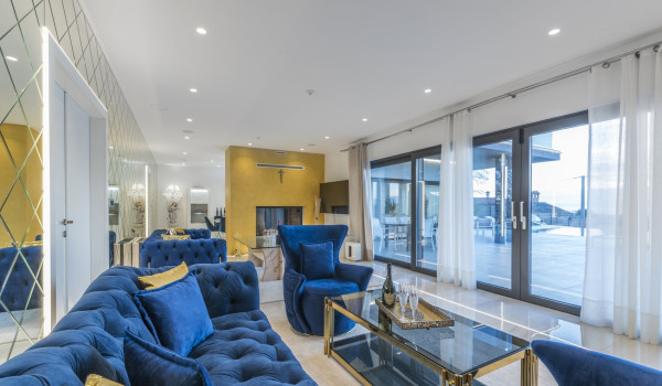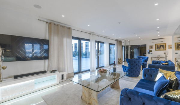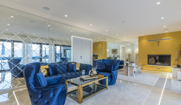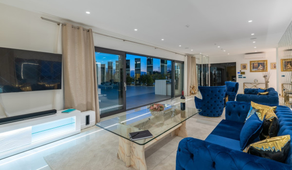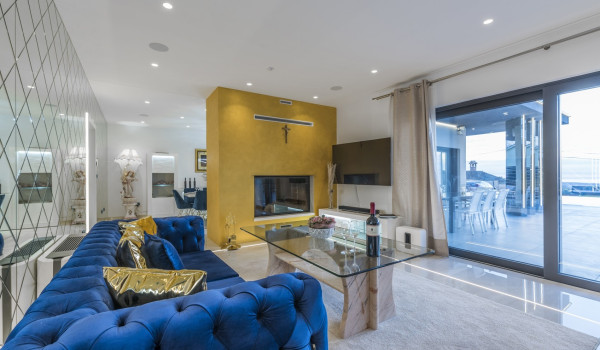 بجوار المطبخ يوجد غرفة معيشة مريحة مع أريكة زاوية عصرية، وثلاث طاولات قهوة سوداء، وتلفزيون LCD، وكراسي سوداء عصرية. هناك أيضًا تناغم تناقض بين الألوان الفاتحة والعناصر السوداء، الأمر الذي يضفي مزيدًا من الأناقة على الفضاء. نظرًا للنوافذ الزجاجية الكبيرة، يتسرب الضوء بكميات كبيرة إلى الفضاء بأكمله، مما يجعله يبدو أكثر فسحًا وهواءً. يتم تزيين الداخل بمجموعة متنوعة من النباتات، التي تشكل رابطًا مع الخارج والطبيعة الدالماتية.