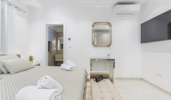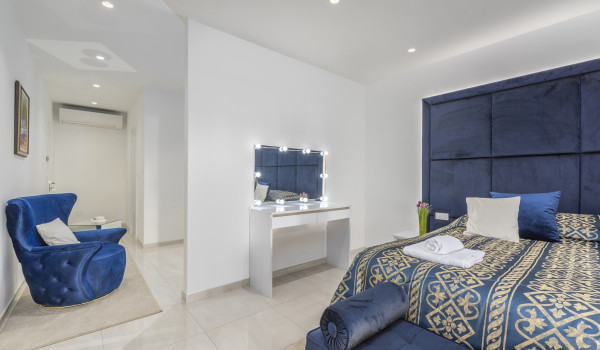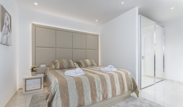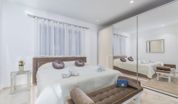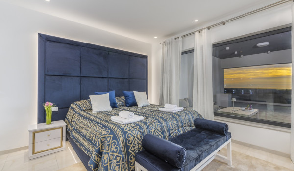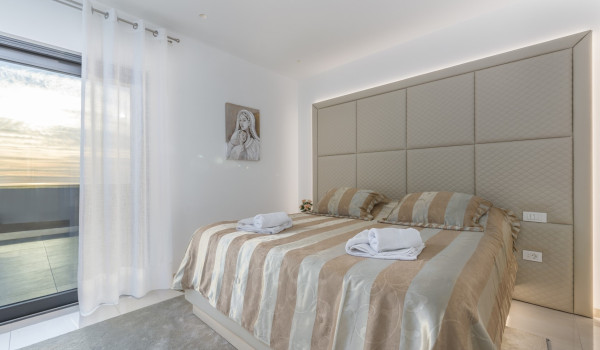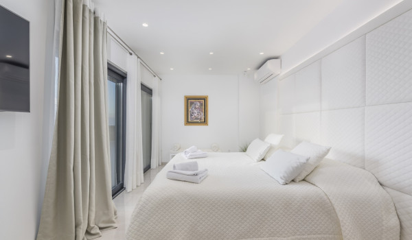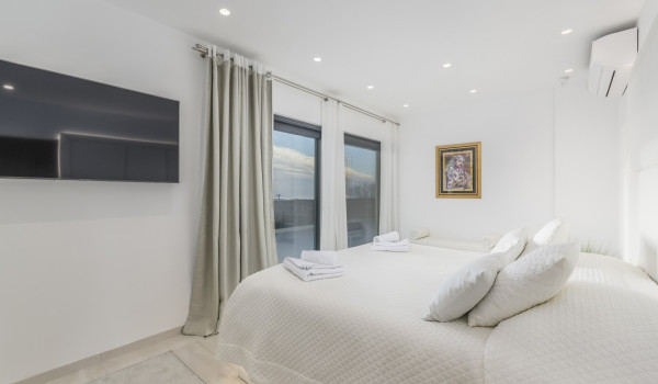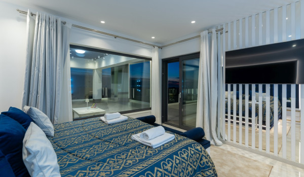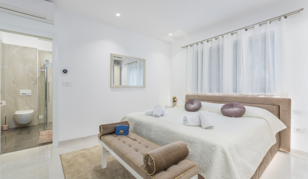 تقودنا السلالم الداخلية السوداء إلى الطابق الأول من هذه الفيلا الكرواتية الحديثة مع حمام السباحة، حيث توجد الغرف الثلاث المتبقية مع حمامات داخلية مع دش. يمكن الوصول إلى الغرف عبر ممر فسيح مزين بلوحة جدارية كبيرة تحمل صورة فتاة. تم تزيين جميع الغرف أيضًا بأسلوب عصري بسيط، وفي داخل كل منها توجد تفاصيل وزخارف تميزها عن الأخرى. تحتوي جميع الغرف على وصولها الخاص إلى شرفة مع منطقة جلوس خارجية تطل على فناء الفيلا مع الحديقة. تحتوي كل غرفة على سرير بحجم كينج وتلفزيون LCD. تم تجهيز الحمامات الداخلية الملحقة بتصميم عصري، ويهيمن على الداخل اللون الأسود، الذي يمتد عبر الداخل وأيضًا الخارج من هذه الفيلا الفاخرة مع حمام السباحة. في أحد حمامات الداخلية الملحقة، يوجد أيضًا ساونا خاصة، مثالية للراحة والاسترخاء.