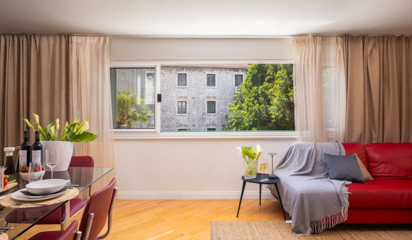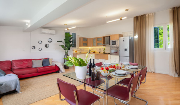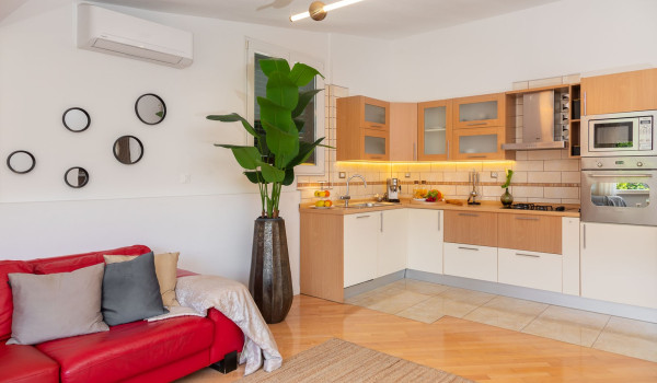 مساحة العيش في هذه الشقة الفاخرة في سبليت، التي تقع بالقرب من العديد من القهاوي والمطاعم، تبلغ 100 متر مربع، والتي تحيط بها أيضًا حديقة خضراء جميلة تنبعث منها رائحة أنواع مختلفة من النباتات الأصلية للبحر الأبيض المتوسط مع غناء الطيور.