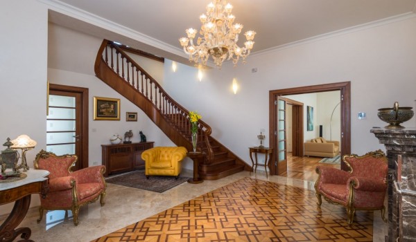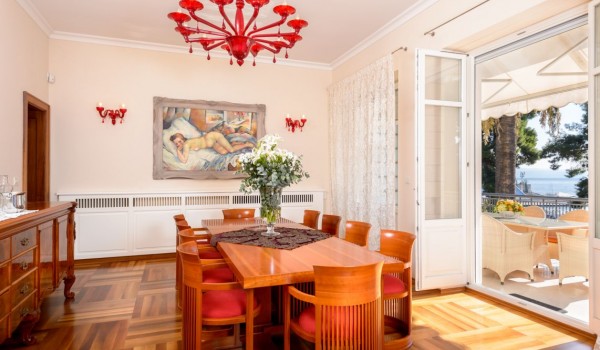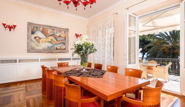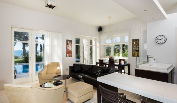 في الطابق الأول ، وجدوا مكانهم المثالي: ردهة مع مدفأة ، وغرفة معيشة فسيحة مزينة بالعديد من اللوحات الفنية، وأرائك جلدية ، وطاولة قهوة مُصممة، وتلفزيون LCD SAT. يتصل من خلال باب مفتوح بغرفة الطعام الفسيحة المزينة بأثاث خشبي عالي الجودة وطاولة كبيرة مع كراسي مرافقة. من غرفة الطعام ، عبر الباب الكبير ، يمكنك الخروج إلى الشرفة الرئيسية مع أثاث الجلوس ، والذي يوفر إطلالة فريدة على البحر.