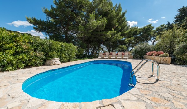 Der attraktivste Inhalt dieser kroatischen Luxusvilla zur Vermietung ist der große Pool mit Steinplateau, der von herrlicher Natur umgeben ist und Privatsphäre sowie vollkommene Entspannung bietet. Nebst dem steht den Gästen auch eine Außendusche zur Verfügung sowie eine Reihe bequemer Gartenmöbel.