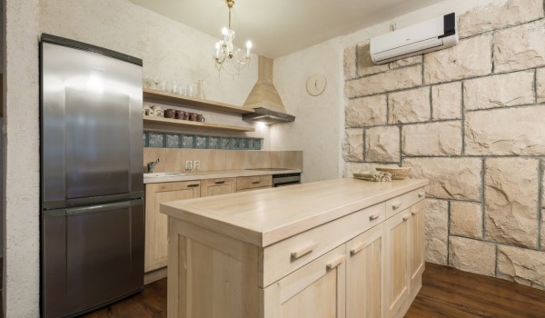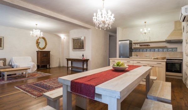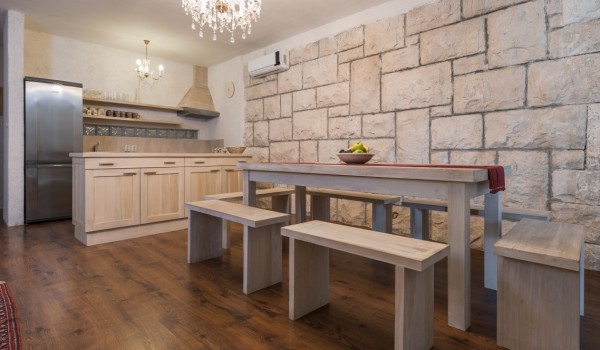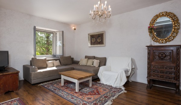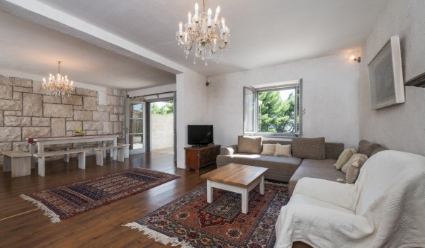 Im Erdgeschoss der kroatischen Villa zur Vermietung befindet sich ein geräumiges, gemütlich eingerichtetes Wohnzimmer mit zwei Sofas und einer großen Terrasse. In diesem Teil finden Sie eine wunderschön eingerichtete und komplett ausgestattete Küche mit Essbereich. Nebst dem, gibt es auch eine separate Toilette.
