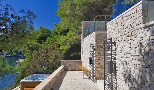 Der Innenhof der kroatischen Mietvilla für Urlaub My Dream ist von Steinmauern umgeben, die eine schöne Symbiose mit dem Äußeren der Ferienvilla bilden, das mit dem berühmten Brac-Stein verziert ist. Der Innenhof der dalmatinischen Inselvilla My Dream ist sehr weitläufig, bereichert durch üppige mediterrane Pflanzen und zahlreiche Terrassen mit Holzplateaus, auf denen Sie sich auf den bequemen Liegen entspannen und sonnen können. Es gibt auch eine Sommerküche mit Kamin, wo Sie dalmatinische Spezialitäten zubereiten können. Der zentrale Teil des Innenhofs wird von einem privaten Pool mit Gegenstromanlage und einem Whirlpool eingenommen.