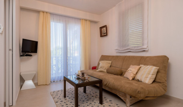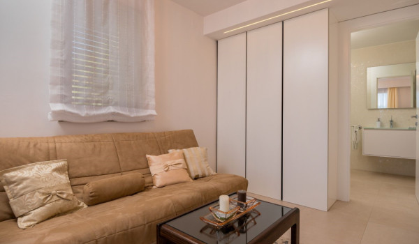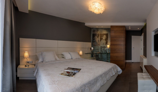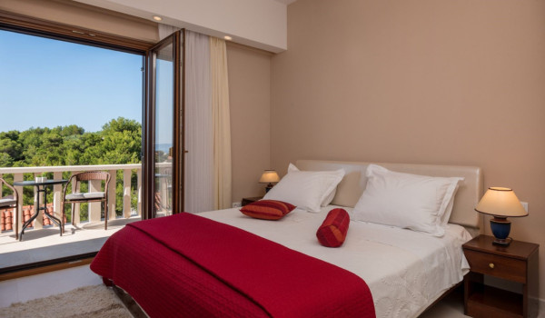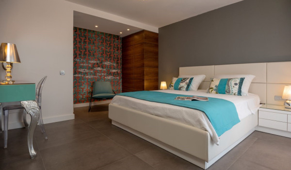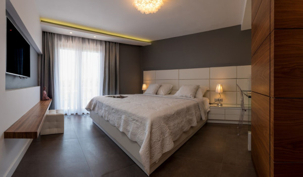 Jedes Schlafzimmer in dieser modernen Mietvilla verfügt über einen eigenen Zugang zu einem privaten Balkon mit einem unvergesslichen Blick auf den wunderschönen Pinienwald und das kristallklare blaue Meer. Vier Schlafzimmer sind mit einem Kingsize-Bett (180*200), einem Fernseher, einer Klimaanlage und einem Kleiderschrank ausgestattet, während das fünfte Schlafzimmer über ein Queensize-Bett (160*200) verfügt.