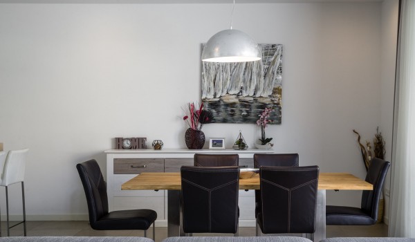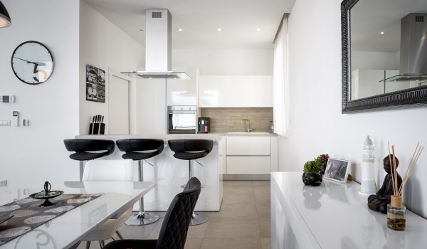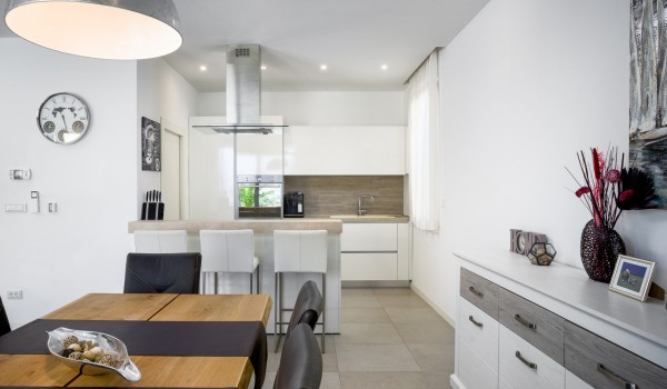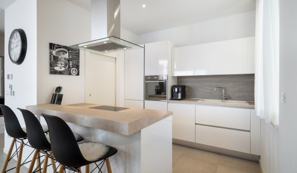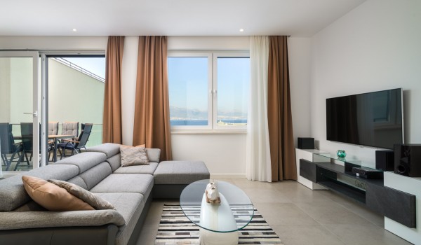 Eine Treppe führt in den zweiten Stock der Luxusvilla Ciovo Joy 4, wo sich ein weiteres Wohnzimmer, 2 Schlafzimmer mit eigenem Bad, eine komplett ausgestattete Küche mit Speisekammer, eine Insel und ein Esszimmer befinden. Außerdem finden wir im zweiten Stock der Luxusvilla Ciovo Joy 1 auch einen Balkon mit Grill und Esstisch für 6 Personen und eine Glaswand, die mit dem Innenraum verbunden ist.