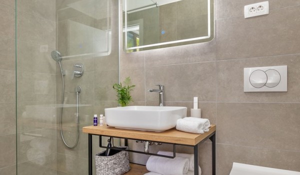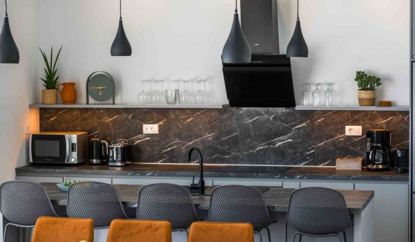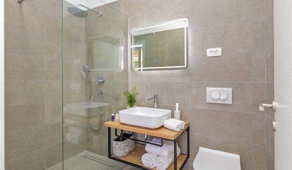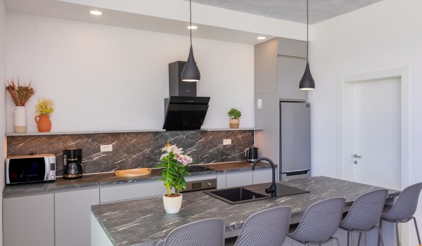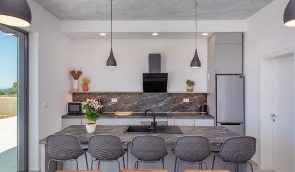 Der Eingang zum Erdgeschoss dieser Luxusvilla in Dubrovnik für Urlaub und Vermietung erfolgt durch Glaswände, die natürliches Licht hereinlassen und mit dem modernen Interieur harmonieren. Im Teil des Erdgeschosses befindet sich ein geräumiges Wohnzimmer mit bequemen Sofas und einem LCD-TV. Eine moderne, voll ausgestattete Küche mit Kochinsel und Essbereich sind unverzichtbarer Bestandteil dieser Etage. Auf dieser Etage befindet sich auch eine Gästetoilette.