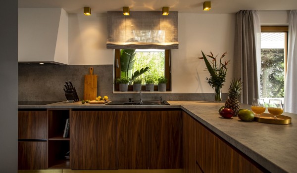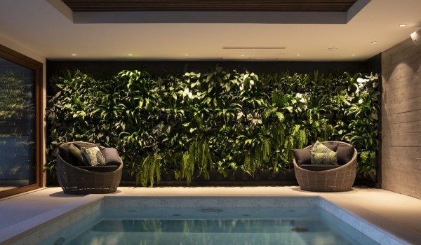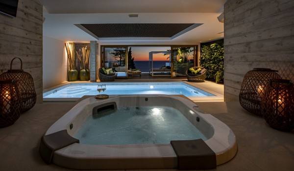 Im Untergeschoss des großzügigen Innenhofs dieser Mietvilla befindet sich eine Terrassenfläche von 44 m2 und ein tropischer Garten unterhalb der Terrasse. Auf der Terrasse befindet sich ein privater Infinity-Pool von 14 m2 mit einer Außendusche, Sonnenliegen, einem Lounge-Sofa und einem Sommer-Himmelbett. Besonderes Augenmerk wurde auf den schönen Garten unterhalb der Terrasse gelegt, wo wir auf tropische Pflanzen wie Pfeilwurz und Bananen mit großen fleischigen Blättern stoßen. Im inneren Teil des Kellers gibt es ein beheiztes Hallenbad von 19 m2, Spa, Whirlpool, Infrarotsauna, Sat-TV, Badezimmer mit Toilette, die zwei Waschbecken hat, eine begehbare Dusche und grüne Wände mit echten Pflanzen , die eine wunderschöne tropische Atmosphäre schaffen. Auch der Keller dieser Ferienvilla ist mit Fußbodenheizung und rutschfester Keramik ausgestattet.