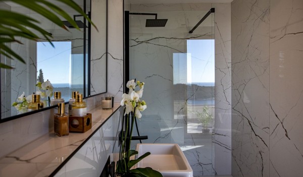 Im ersten Stock dieser privaten Luxusvilla finden wir drei Schlafzimmer, von denen eines ein Hauptschlafzimmer ist. Das Hauptschlafzimmer ist mit einem Sat-TV, einem Kingsize-Bett, einem großen Wandschrank, französischen Fenstern und einer kleinen Loggia ausgestattet. Das eigene Badezimmer des Hauptschlafzimmers verfügt über eine ebenerdige Dusche, einen Whirlpool und 2 Waschbecken. Die anderen beiden Zimmer auf dieser Etage haben Zugang zu einem gemeinsamen Balkon/Terrasse mit Meerblick und sind mit Sat-TV, Queensize-Betten und eigenem Bad mit Dusche ausgestattet. Auf dieser Etage befindet sich auch eine Waschküche.
