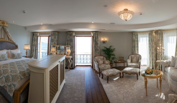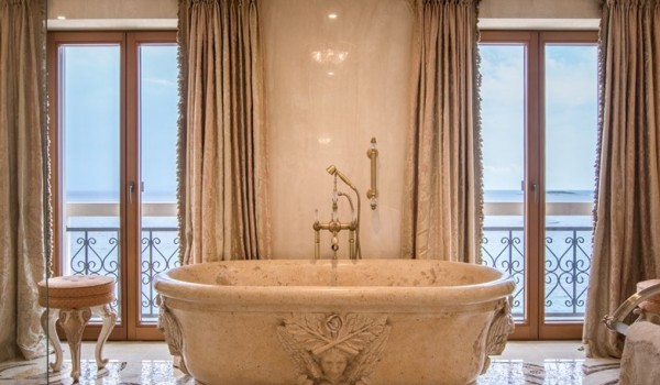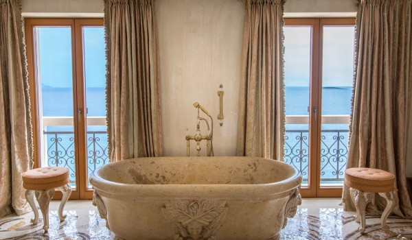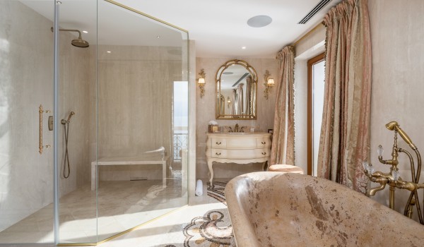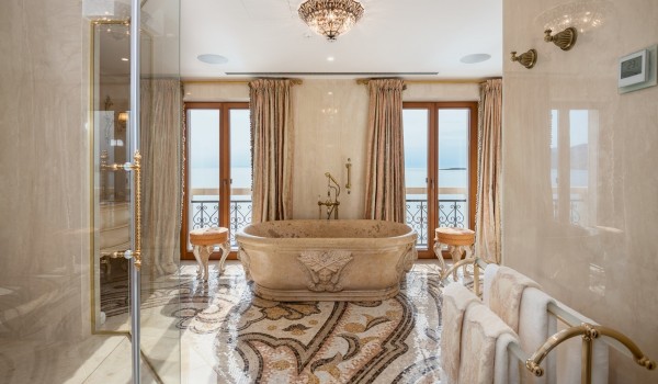Den ersten Stock dieser Ferienvilla erreichen wir über einen Aufzug oder eine Innentreppe. Es gibt drei Suiten auf dieser Etage. Im linken Flügel befindet sich die erste Suite, die aus einem Schlafzimmer und einem Badezimmer besteht. Das Schlafzimmer verfügt über ein Kingsize-Bett, Meerblick, einen LCD-TV, eine Sitzecke und einen begehbaren Kleiderschrank. Das schöne Badezimmer ist aus italienischem Marmor gewebt, hat eine Dusche und eine Designer-Badewanne, sowie ein Waschbecken für Sie und Ihn. Die zweite Suite ist die sogenannte Junior Suite und besteht aus einem Schlafzimmer und einem Badezimmer. Das Schlafzimmer hat Meerblick, LCD-TV, Sitzecke, begehbaren Kleiderschrank und zwei Kinderbetten. Das Badezimmer ist mit einer Dusche ausgestattet. Zwischen der ersten und der zweiten Suite befindet sich ein sorgfältig eingerichtetes Wohnzimmer mit bequemen Sitzgelegenheiten, einem LCD-TV und einem Schreibtisch mit Computer. Es ist mit einer perfekt geschnitzten Holzdecke und einem Tisch mit Lederdetails dekoriert. In der Fortsetzung des Aufenthalts gibt es eine Bar mit Waschbecken, die sich hervorragend für Geselligkeit und Partys eignet. Die dritte Suite auf dieser Etage besteht wie die ersten beiden aus einem Schlafzimmer und einem Badezimmer. Das glamouröse Schlafzimmer verfügt über ein Kingsize-Bett, Meerblick, einen begehbaren Kleiderschrank, einen LCD-TV, ein bequemes Sofa und einen Sessel. Das geräumige Badezimmer ist mit zwei Waschbecken, einer Dusche und einer Badewanne ausgestattet.