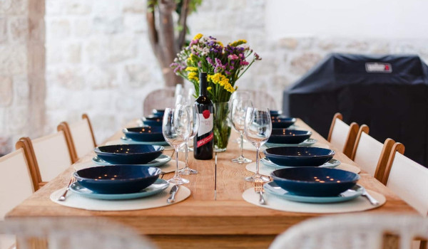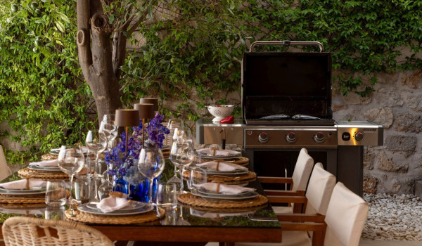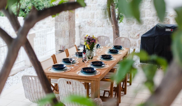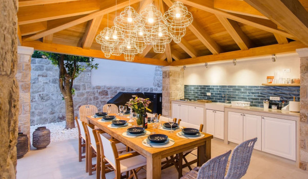 Die luxuriöse Villa Opulent Dubrovnik verfügt über einen beheizten Swimmingpool mit Sonnenliegen, eine Außendusche, eine überdachte Terrasse mit Esstisch und Stühlen, eine Sommerküche mit Spüle und Gasgrill.
