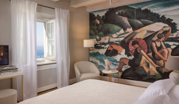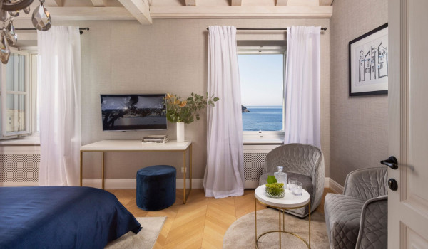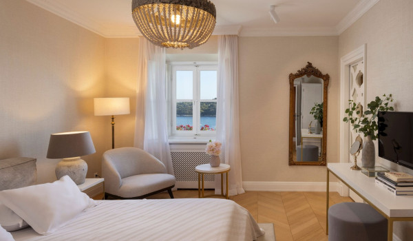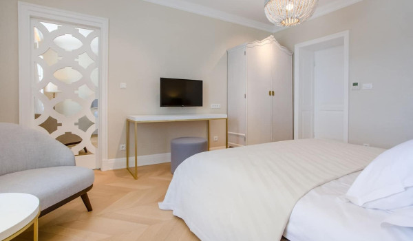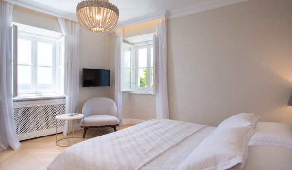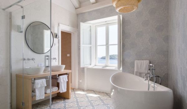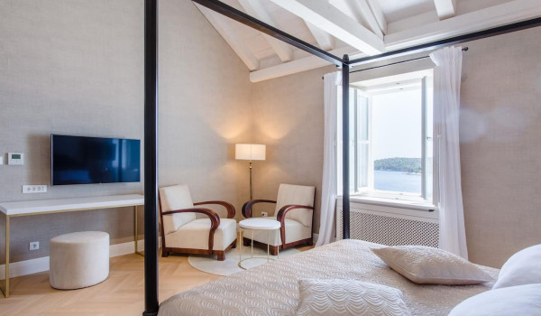 Im ersten Stock der Luxusvilla Opulent Dubrovnik, der über interne Treppen mit dem Erdgeschoss verbunden ist, gibt es einen Flur, der mit alten Fotos und antiken Artefakten dekoriert ist, um die Gäste mit einem Teil der Tradition vertraut zu machen. Der Flur trennt die drei Schlafzimmer. Das erste Schlafzimmer verfügt über ein Kingsize-Bett und ein eigenes Bad mit Dusche und einem Fenster mit wunderschönem Panorama. Das zweite Schlafzimmer, mit atemberaubender Aussicht, verfügt ebenfalls über ein Kingsize-Bett und ein eigenes Bad mit Dusche. Das dritte Schlafzimmer verfügt über ein Kingsize-Bett, ein eigenes Bad mit Dusche und begehbarem Kleiderschrank.