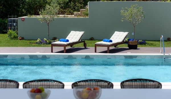 Auf der großzügigen Außenterrasse mit dem schönsten Blick auf die Landschaft und den gepflegten Garten gibt es einen beheizten 5x10 m großen Pool, Sonnenliegen und eine Außendusche sowie ein Grill und ein Esstisch für 8 Personen.
