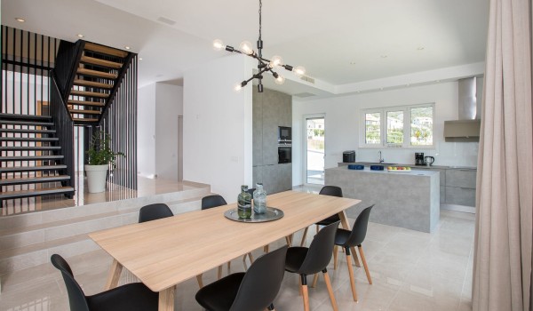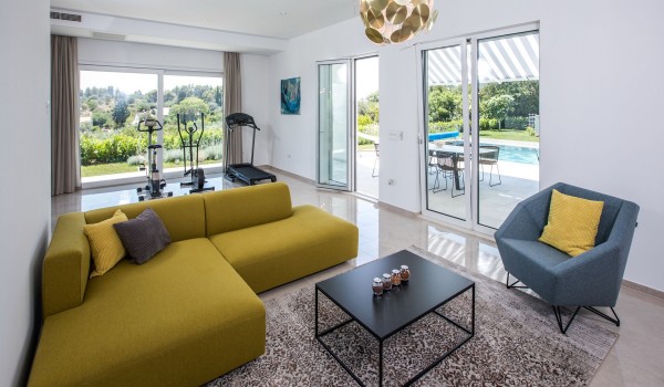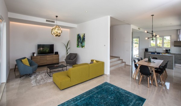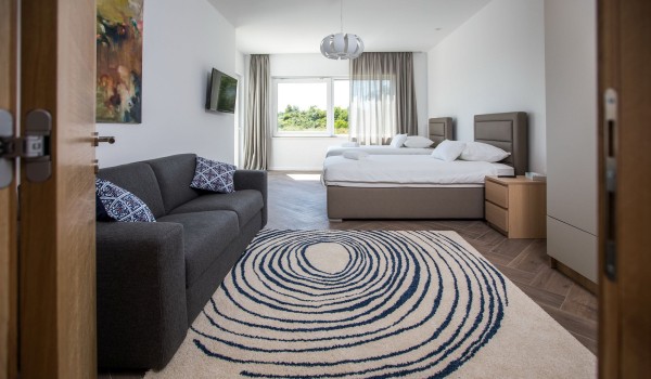 Das Erdgeschoss dieser kroatischen Urlaubsvilla hat dank der großen Schiebetür Zugang zur Terrasse, durch die wir einen herrlichen Blick auf die Umgebung haben. Auf der Westseite des Erdgeschosses befindet sich ein modernes Wohnzimmer mit einem Fitnessbereich. Neben dem Wohnzimmer befindet sich ein Esstisch für 8 Personen und eine ausgestattete geräumige Küche mit Bar in der Mitte. Weiterhin finden Sie hier eine private Garage und eine Gästetoilette.