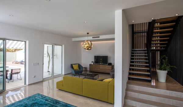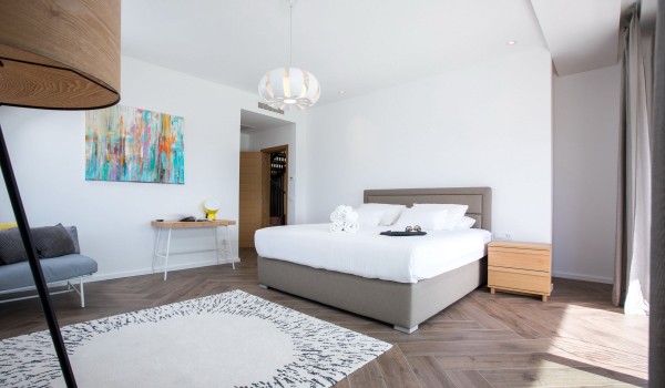 Die Holztreppe führt in den ersten Stock mit 2 Zimmern mit Kingsize-Betten und eigenem Bad mit Badewanne und Dusche. Das dritte Zimmer mit Kingsize-Bett hat ein eigenes Badezimmer mit Dusche, während das letzte Zimmer ein separates Bett und ein eigenes Badezimmer mit Dusche hat. Auf dieser Etage befinden sich 4 Zimmer mit eigenem Bad. Alle Zimmer verfügen über LCD-Fernseher und Balkone, auf denen Sie gemeinsam die Sonne genießen können.
