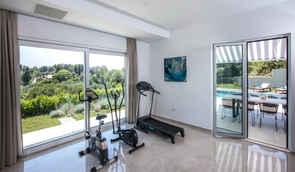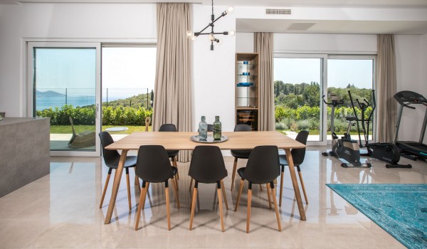 Im Erdgeschoss verfügt die kroatische Luxusvilla Orasac Home Escape mit beheiztem Pool über eine voll ausgestattete Küche, einen Wohnbereich mit Tisch für 8 Personen, eine Toilette und ein Wohnzimmer mit Fitnessgeräten.