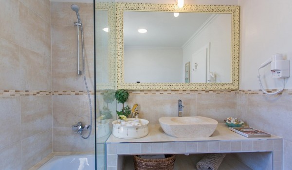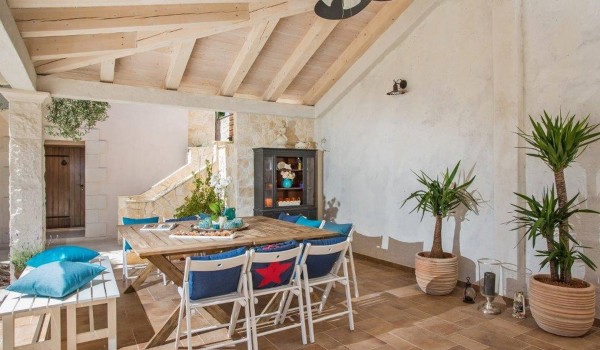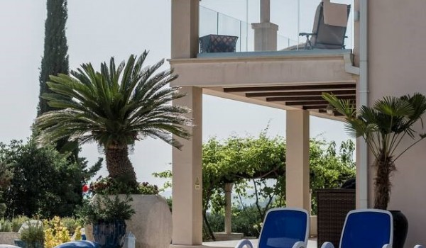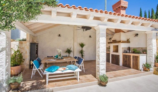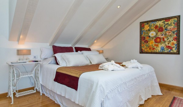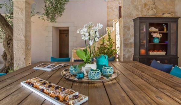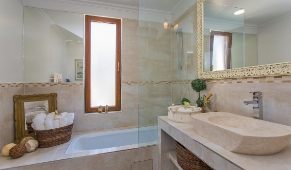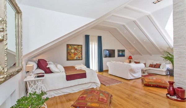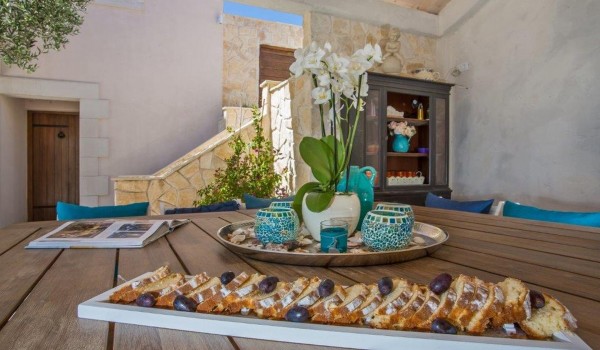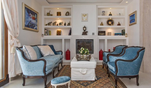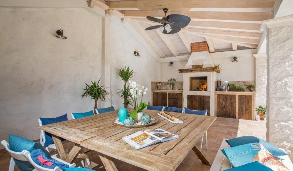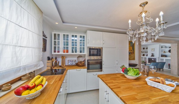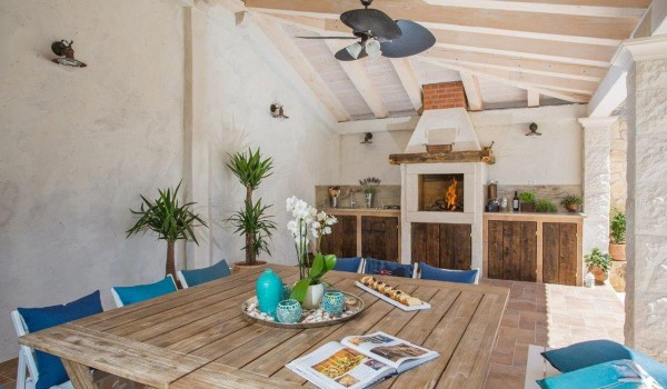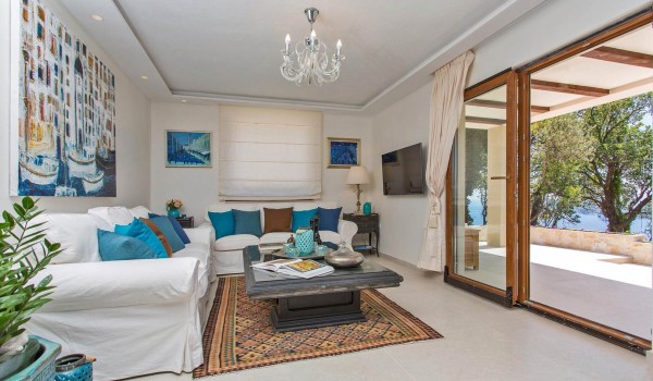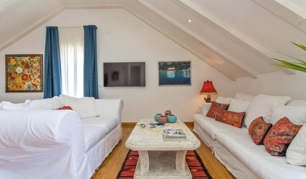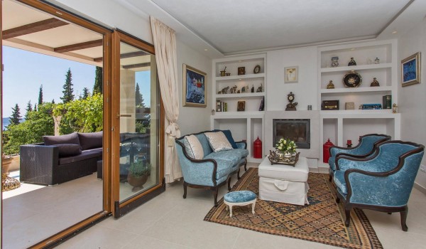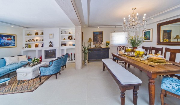 Von der großen Terrasse betreten Sie ein charmantes Wohnzimmer mit bequemen Sofas, einem Kamin und einem LCD-Fernseher. Auf dieser Etage befindet sich auch eine geräumige, sorgfältig ausgestattete Küche, die mit dem Esszimmer mit einem Tisch für 12 Personen verbunden ist. Das Innere strahlt Wärme aus, und die künstlerischen Gemälde und Details verleihen dieser Villa eine besondere Note.