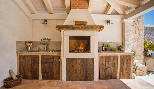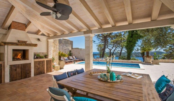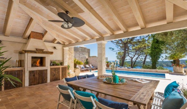 Die luxuriöse Villa Orasac Sweet Life verfügt über eine geräumige Außenterrasse mit Pool, Sonnenliegen und Sitzgelegenheiten im Freien. Die Gäste können auch die überdachte Sommerküche mit einem Holzkamin und einem großen Esstisch nutzen.