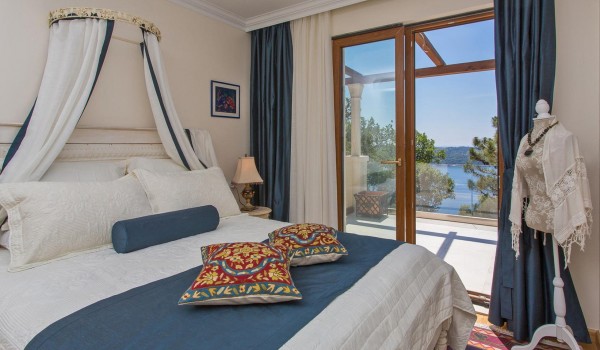 Die Treppe führt zum zweiten Stock der luxuriösen kroatischen Mietvilla Orasac Sweet Life, wo sich das Hauptschlafzimmer befindet, das eine Fläche von 80 Quadratmetern mit eigenem Badezimmer mit Dusche und Badewanne abdeckt. Neben dem Kingsize-Bett gibt es einen Sitzbereich mit zwei Sofas und einem LCD-Fernseher. Das Hauptschlafzimmer hat Zugang zu einem Balkon mit Sitzbereich und Blick auf das blaue, klare Meer, Zypressen und Kiefern vor der Villa und nahe gelegene Inseln. Auf dieser Etage befindet sich ein zusätzliches Zimmer mit Queensize-Bett und einem Gemeinschaftsbad.