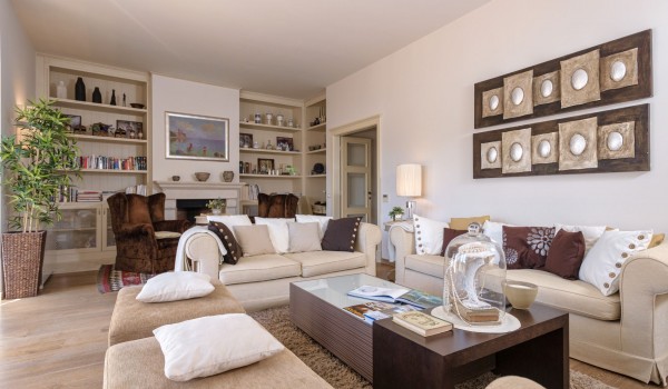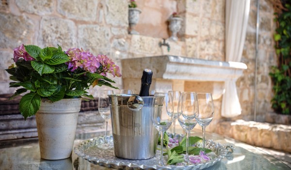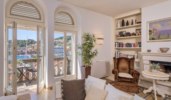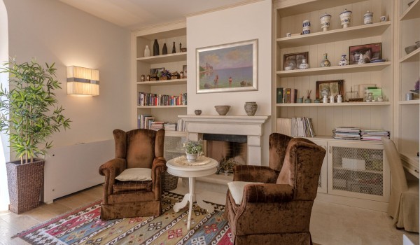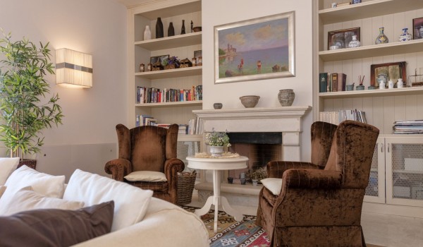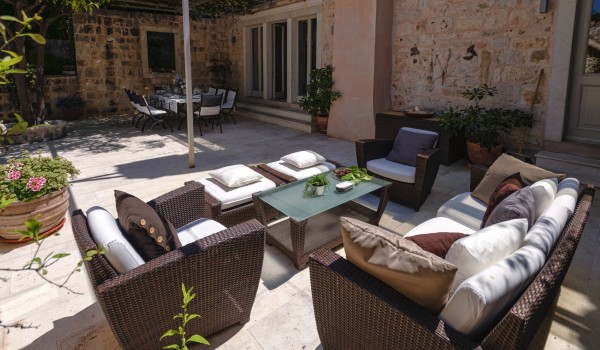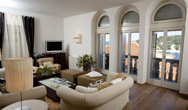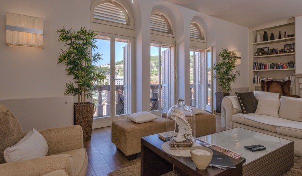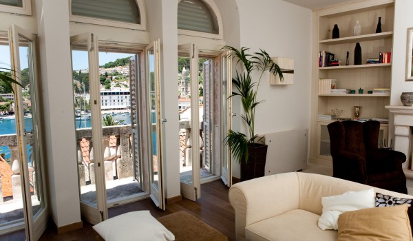 Der Haupteingang zur barocken Palastvilla Hvar befindet sich im Hochparterre, wo sich ein geräumiges Wohnzimmer (45 m²) mit großem Barockbalkon befindet. Das Wohnzimmer ist harmonisch eingerichtet und passt sich der Gesamtatmosphäre und dem Ambiente dieser historischen Sommerresidenz an. Neben der außergewöhnlichen Atmosphäre in Bezug auf die Inneneinrichtung ist das Wohnzimmer tatsächlich ein voll funktionsfähiger Raum für Ihre maximale Entspannung und Freude, ausgestattet mit Sitzmöbeln, einem Kamin und modernen High-Tech-Geräten (Sat-TV, DVD-Player, Computer mit Internetverbindung). Hier steht den Gästen auch die Hausbibliothek mit zahlreichen Büchern, Publikationen und verschiedenen Zeitschriften in verschiedenen Sprachen zur Verfügung.