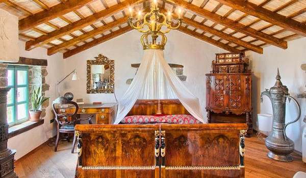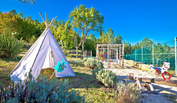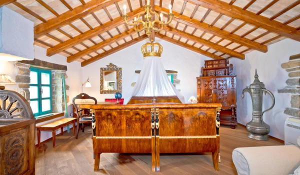 Arriving at the property of this luxury holiday villa Stone Paradise Motovun, you arrive at the private parking lot of this Istrian 6-bedroom villa for rent. You are on a 30,000 m2 property where, in addition to the spacious villa itself, there is an outdoor swimming pool (100 m2) with a sun deck, a playground, a children's playground, a formal outdoor area for weddings, a sitting lounge with a gazebo on the outdoor terrace surrounded by various statues and sculptures from different cultures around the world. Entering this beautiful villa for a family holiday, you pass through the double wooden doors and come to the living room equipped with sofas, a coffee table, an LCD TV, a rustic chest of drawers, and various accessories and decorations.
