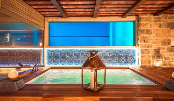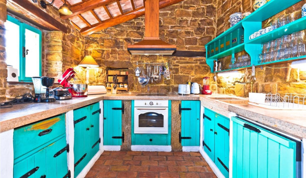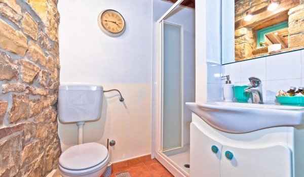 On the first floor of this unique private rental villa for family vacations in Istria, next to the spacious living room, there is a fully equipped kitchen with an oven, toaster, coffee machine, kettle, refrigerator, dishwasher, freezer, high chair, and in its extension, there is a dining table with chairs and an indoor fireplace for preparing famous local specialties. This luxury villa has 6 bedrooms, 3 of which have 2 single beds and the remaining 3 bedrooms have a large double king-size bed. The bedrooms are equipped with rustic chests of drawers and armchairs, and some of them have an en suite bathroom and a baby cot available. There are two bedrooms on each floor. In the bathrooms, there are toiletries, a hair dryer, a bath/shower, towels, etc. This family vacation villa for 12 has one large apartment with 2 additional rooms, a bathroom, and access to a spacious terrace with deckchairs that overlooks the wooded hills. and the beautiful, small picturesque town of Motovun, which is located on top of the hill itself. In this private Istrian villa for a vacation with friends, there is also a wellness oasis with a jacuzzi and a Finnish sauna, as well as a sitting lounge.