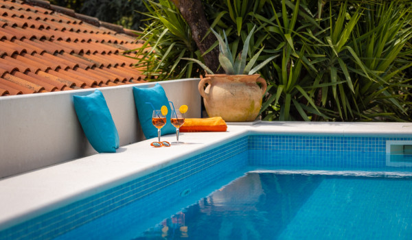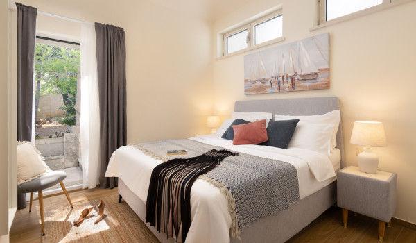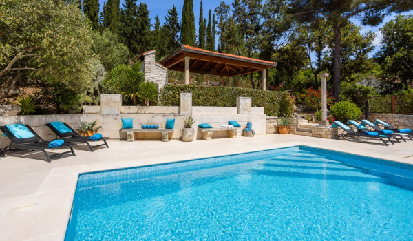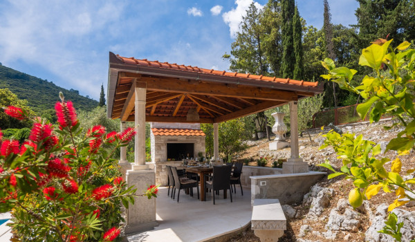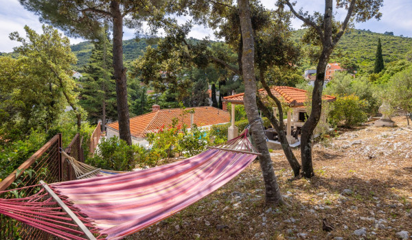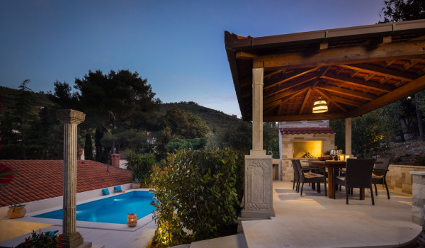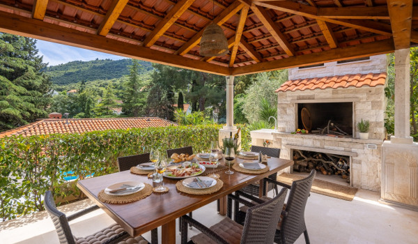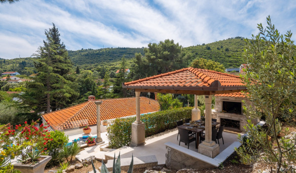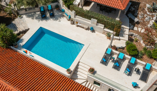 Rund um das gesamte Haus erstreckt sich ein mediterraner Garten mit Kräutern und Pflanzen. Der Bereich hinter dem Haus ist für Entspannung und Unterhaltung konzipiert, mit einem 30 m² großen Außenpool, Liegestühlen und einer großen überdachten Terrasse. Im überdachten Bereich befindet sich ein Esstisch für 8 Personen, ideal zum Genießen von dalmatinischen Spezialitäten, die am großen Steingrill (ausgestattet mit Grillrost und Peka) zubereitet werden. Hinter dem Pool und dem Olivenhain stehen wunderschöne Zypressen, die vor 40 Jahren gepflanzt wurden. Zu den vielen Annehmlichkeiten der Villa gehört auch ein Bootsanlegeplatz für Boote bis zu 7 Meter Länge – ideal für verschiedene Ausflüge.