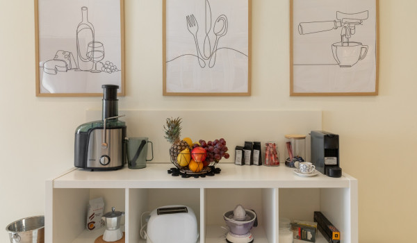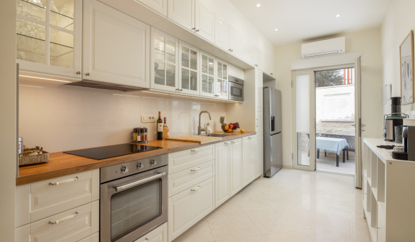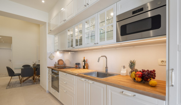 Vom Wohnbereich gelangt man in die voll ausgestattete Küche, die mit allen notwendigen Haushaltsgeräten ausgestattet ist: Herd, Kühlschrank, Gefrierschrank, Eiswürfelbereiter, Backofen, Mikrowelle, Wasserkocher, Toaster, Kaffeemaschine, Geschirrspüler und ein Küchentisch. Von der Küche aus hat man Zugang zum Außenbereich und Garten.