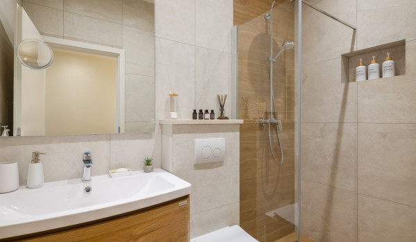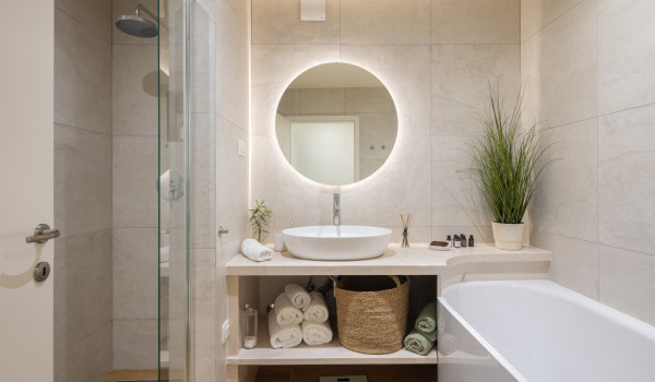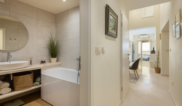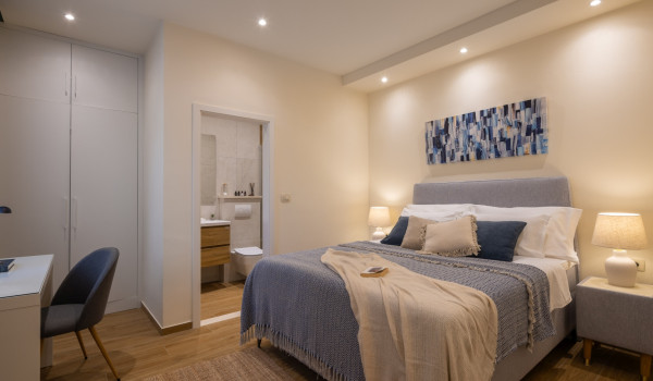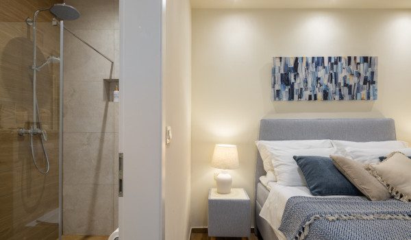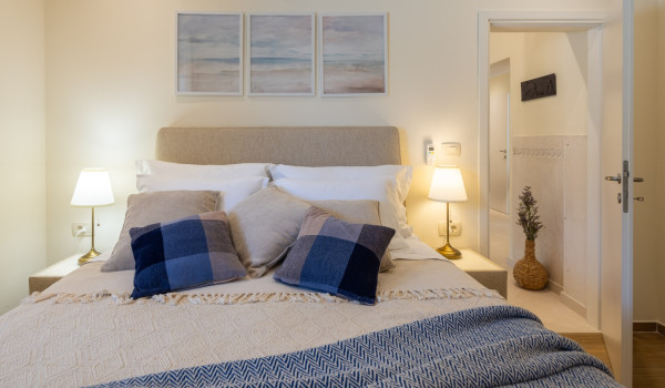Das erste der beiden Zimmer bietet ein Queensize-Bett, einen Kleiderschrank, einen Schreibtisch mit Gepäckablage, Verdunkelungsvorhänge, Klimaanlage und Fußbodenheizung. Das zweite Zimmer verfügt ebenfalls über ein Queensize-Bett, Kleiderschrank, Verdunkelungsvorhänge, Klimaanlage, Fußbodenheizung und einen Fernseher. Jedes Schlafzimmer hat ein eigenes Badezimmer en suite mit Dusche, Toilette, Handtüchern, Haartrockner und luxuriösen Pflegeprodukten. Das dritte Schlafzimmer befindet sich im anderen Teil des Hauses, im Anschluss an den Essbereich. Es ist mit einem Kingsize-Bett, Kleiderschrank, Fernseher, Verdunkelungsvorhängen, Klimaanlage und Fußbodenheizung ausgestattet. Dieses Zimmer hat ein privates Badezimmer, das sich direkt daneben befindet und über Badewanne, Dusche, Handtücher, Haartrockner und luxuriöse Badezimmerartikel verfügt. Daneben befindet sich ein separates Gäste-WC.